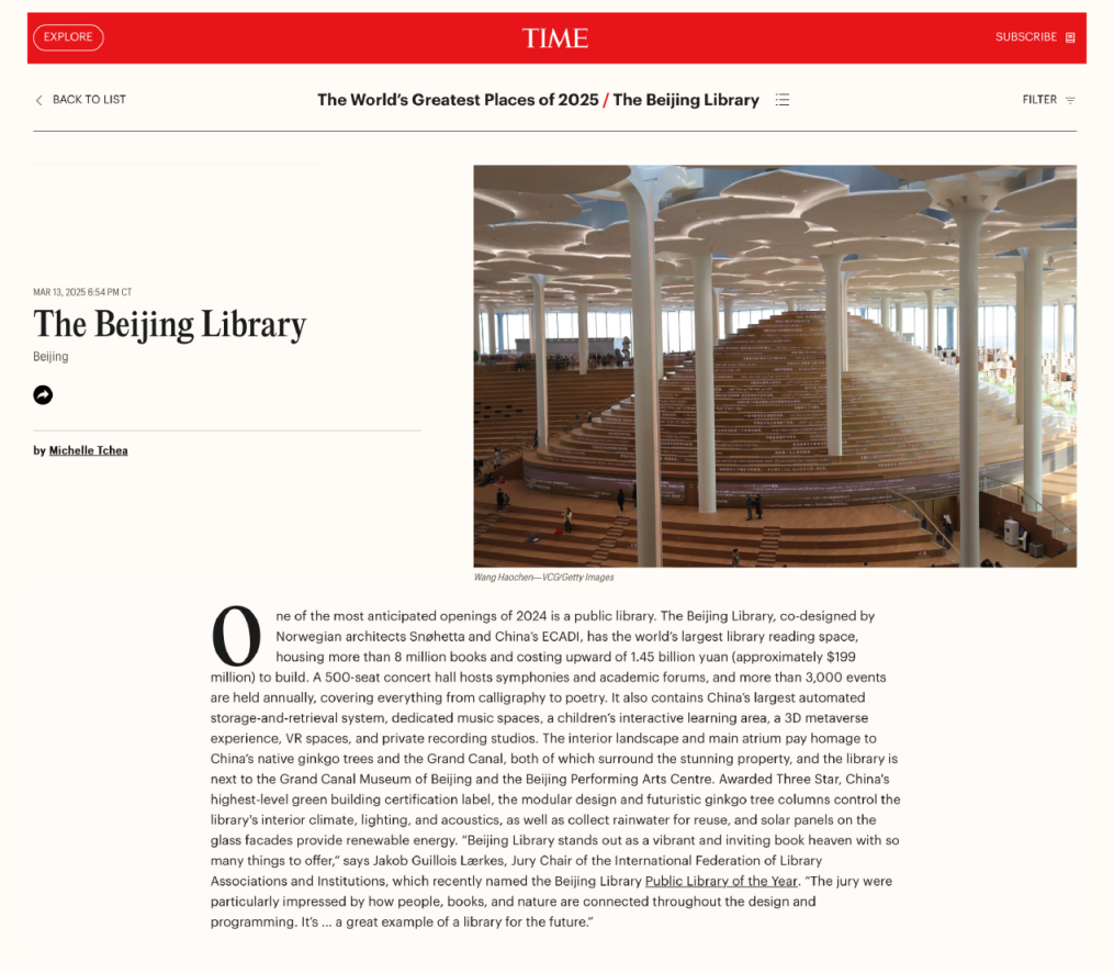 作为重要的新晋文化地标,北京城市图书馆凭借卓越的设计理念与可持续实践,荣获美国建筑师协会香港分会2025年度荣誉设计奖建筑类优异奖与可持续设计奖;数据可视化系统和“版画中轴——珍藏版画典籍展”分获A'DesignAward大奖白金奖和德国iF设计奖;少年儿童馆“阅读花园”和元宇宙体验馆分获IFLAPressReader国际营销奖第二名和VegaDigitalAwards最佳交互金奖;并入选《TIME时代周刊》2025年度全球100佳旅行目的地榜单。