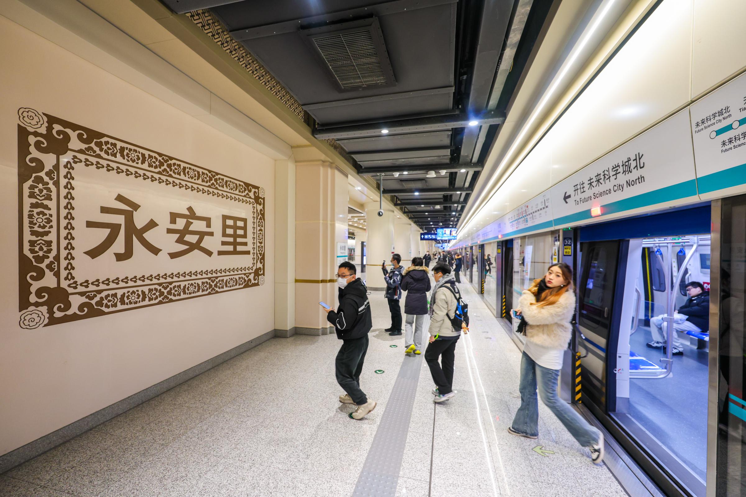 17号线中段开通首日,三座高颜值新站吸引着许多乘客拍照打卡。永安里站站厅内,《东方之韵》壁画聚人气,琉璃瓦片、古建筑剪影上墙。“车站藻井造型吊顶,新中式风格装修,与长安街的宏伟大气非常匹配。”正在给孩子讲解壁画的胡女士说。