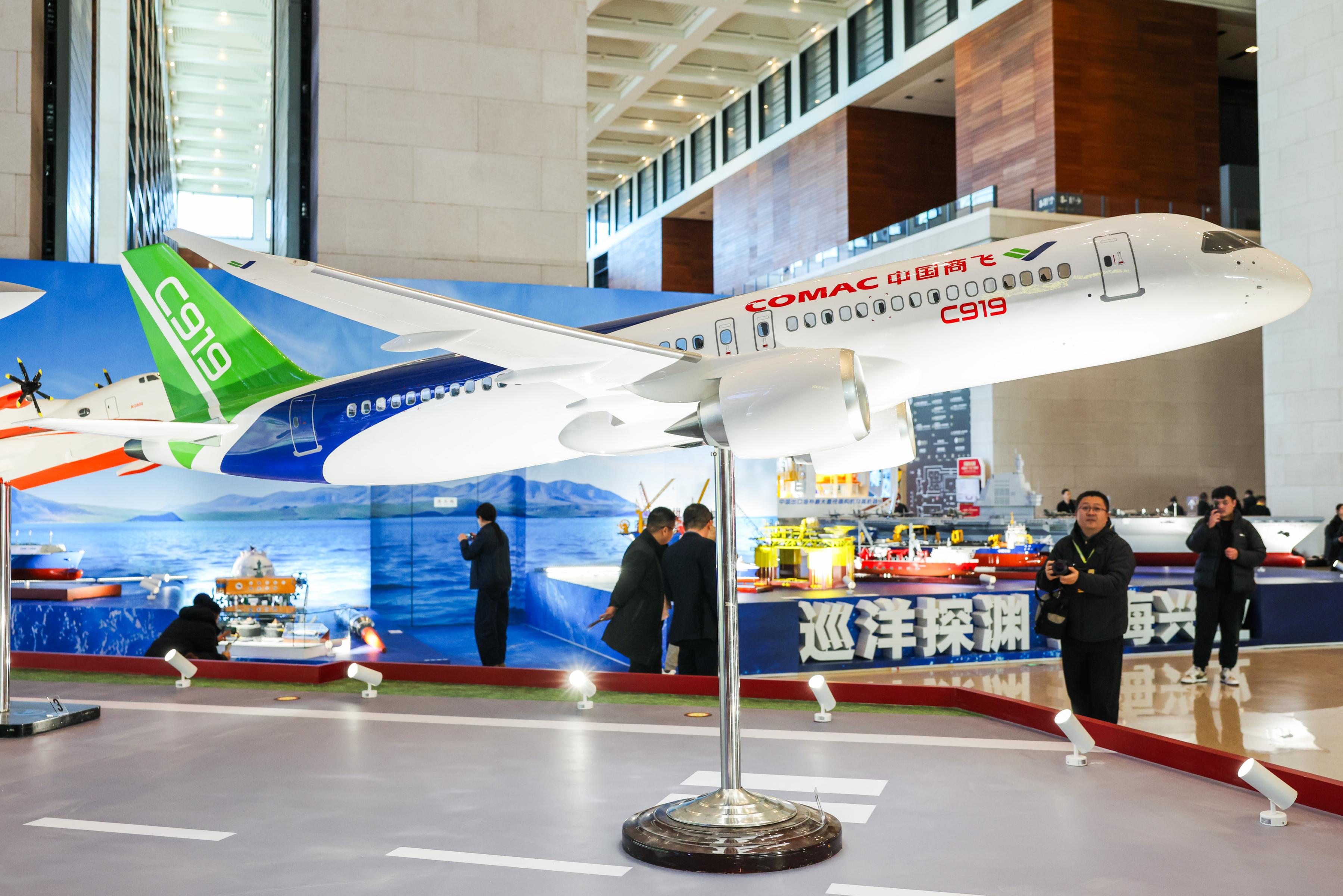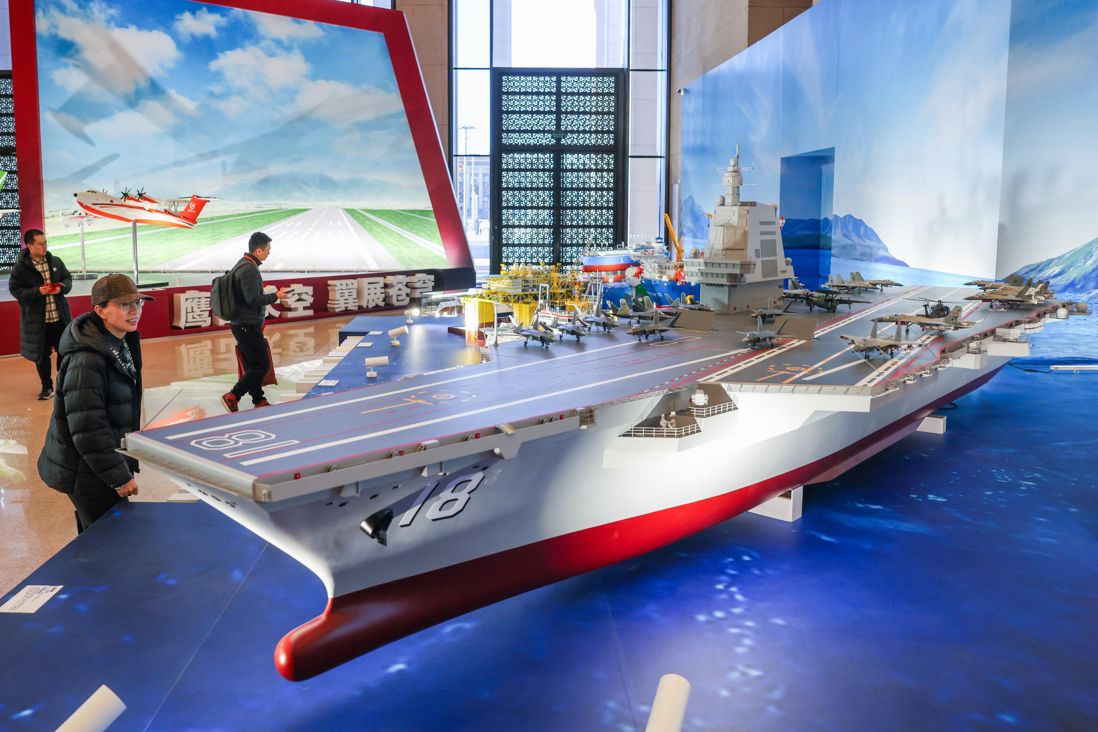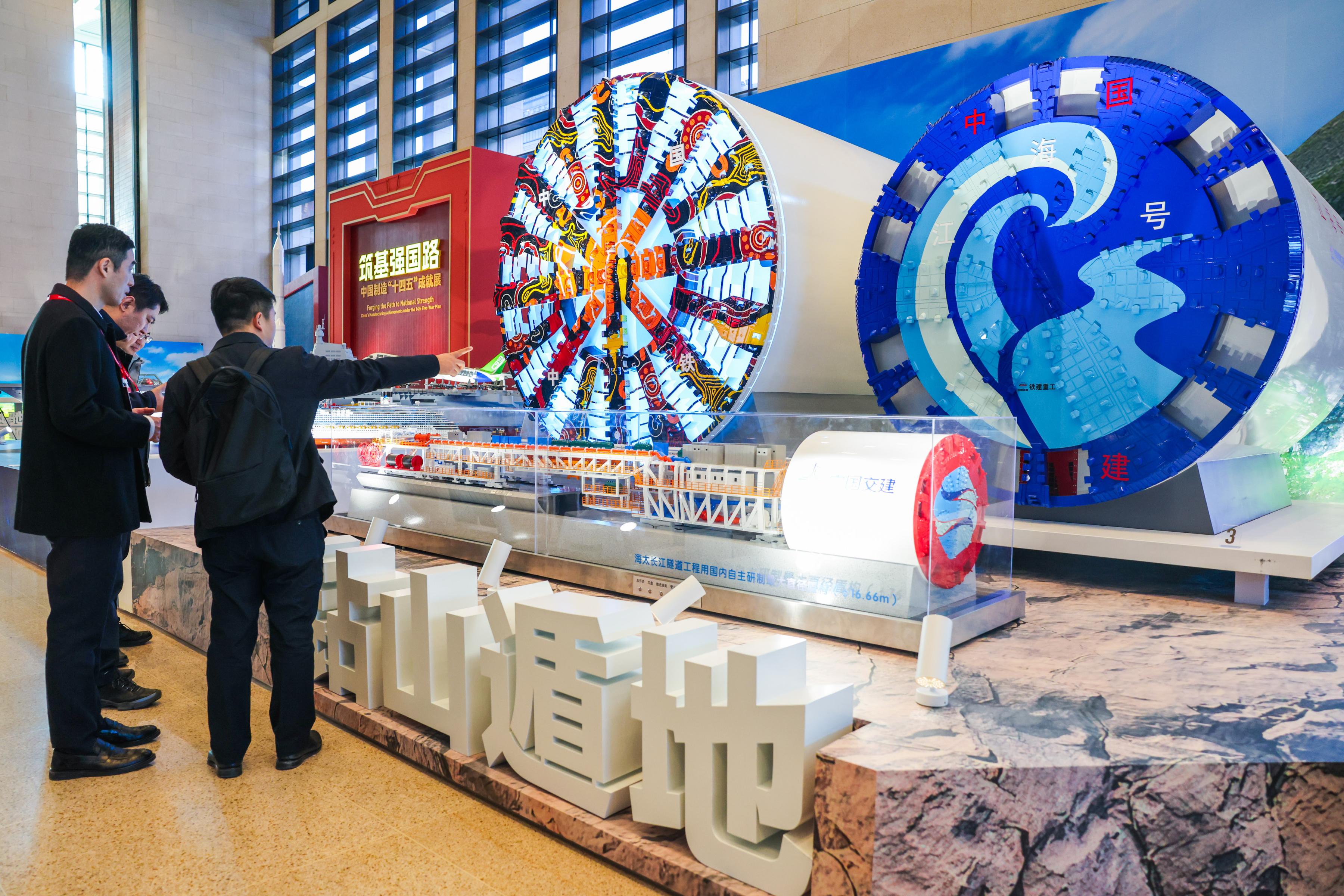 硬核展品凑成矩阵,观众移步可以饱览“国之重器”。国博1层大厅,“国宝”最扎堆,长征系列运载火箭、中国空间站和神舟飞船的模型被搬到眼前,C919大型客机、AG600大型水陆两栖灭火飞机和歼-35隐形舰载战斗机模型停靠在一个展台,一旁停泊着福建舰模型。中心的造型展台以微缩模型的形式展示白鹤滩水电站、深中通道、花江峡谷大桥等十余项重大工程。观众可以通过一个个精准的微缩比例数据,领略“重器”的实力。