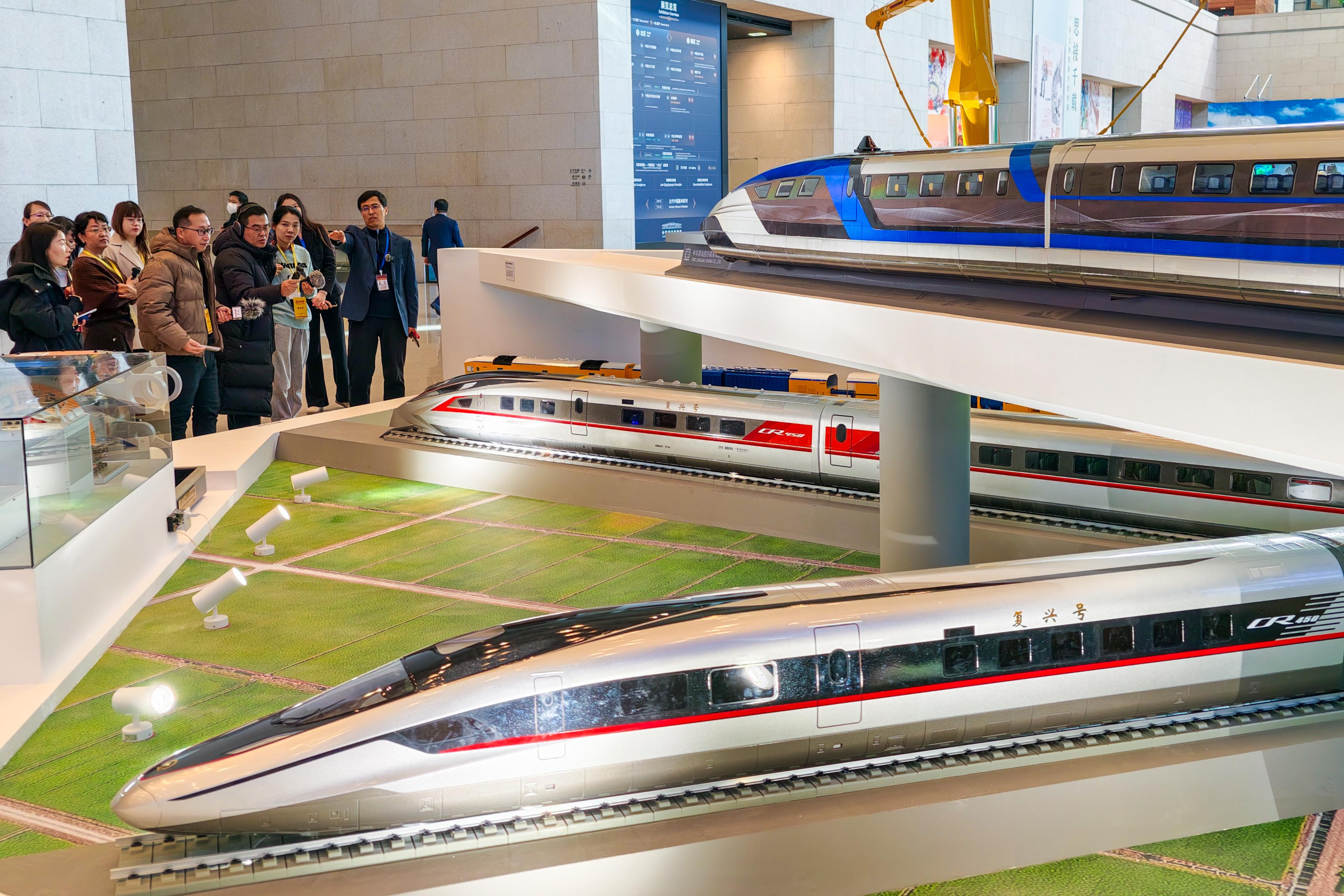 为了让观众可以不费力地看懂硬核科技,策展团队将整体与局部打通,打造“整机与零部件功能关联场景”。以先进轨道交通展区为例,现场陈列CR450动车组、时速600公里高速磁浮列车等整机模型,下方展台同步设置“核心零部件专区”,直观呈现零部件与整机的协同运行逻辑,让硬核制造知识生动可感。