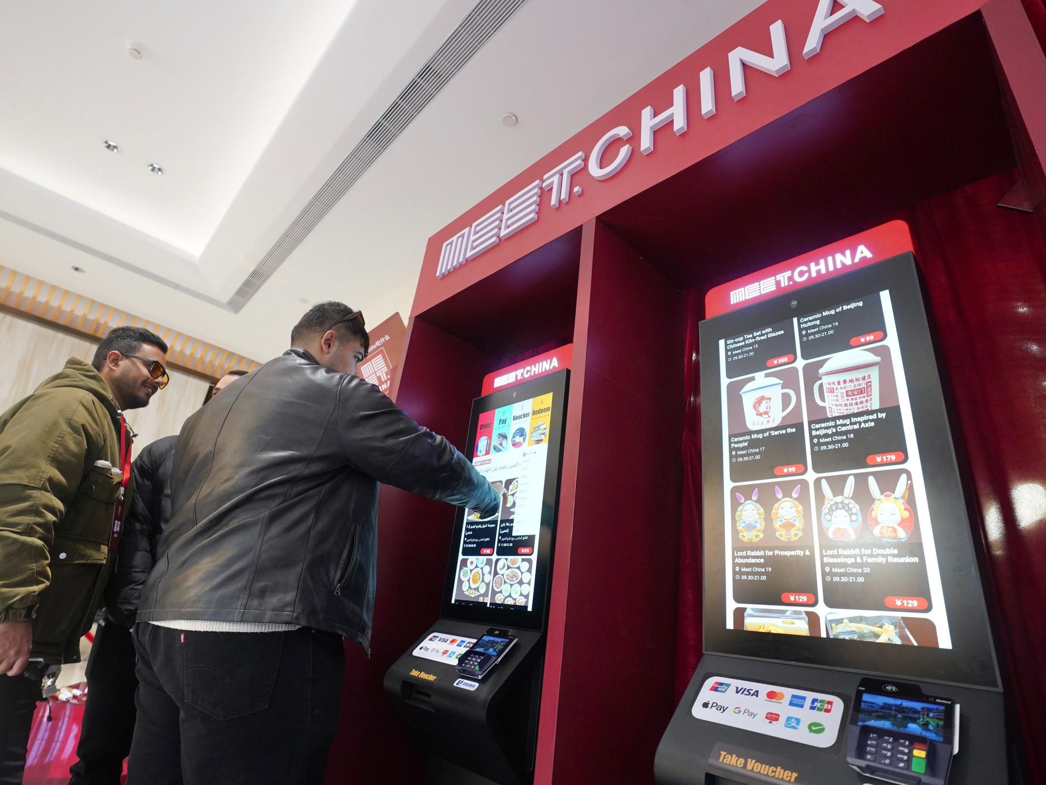 在“礼物”页面中,阿尔巴尼亚小伙子亨利看中了一只兔儿爷。点击“购买”后,直接刷他的本国银行卡,就完成了秒级支付。随着清脆的“叮”声,支付完成,机器吐出来了一张小票。“买东西太丝滑了!”他笑着向记者展示手中的小票,随后就去商店核销、领取商品了。