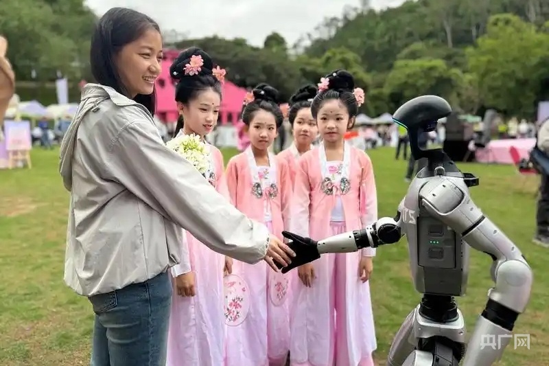 厦门海沧天竺山桐花旅游季活动现场,游客与机器人互动(央广网记者 吴馨骅 摄)