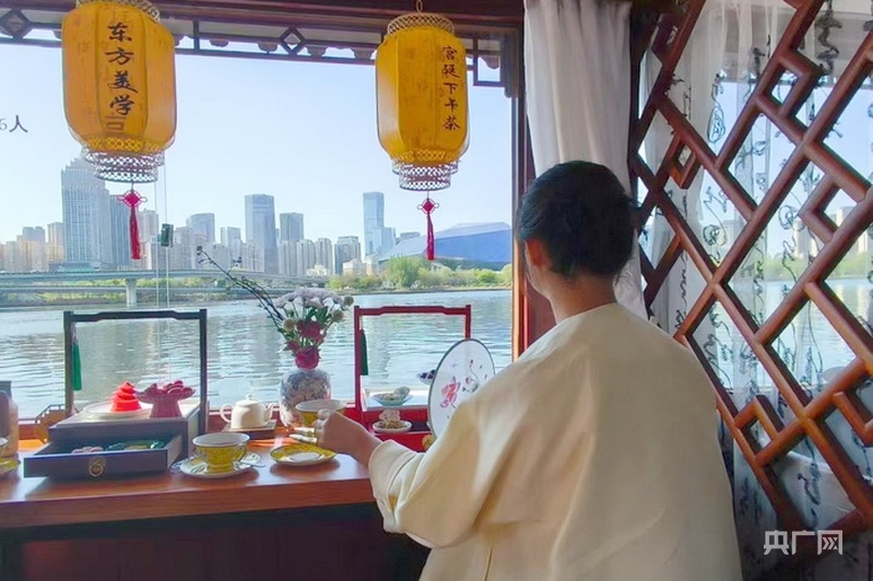 在辽宁沈阳一艘游船上,游客一边欣赏河景,一边品尝特色下午茶(央广网记者 李子平 摄)