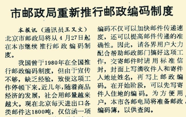 包括北京日报在内的多家报社在报纸上带头刊登自己的邮政编码,同时按照国家标准印制各自的专用信封。在各大报纸的推动下,填写邮政编码的人越来越多。(1987年9月24日《北京日报》2版,《首都各家大报率先刊登邮政编码》)