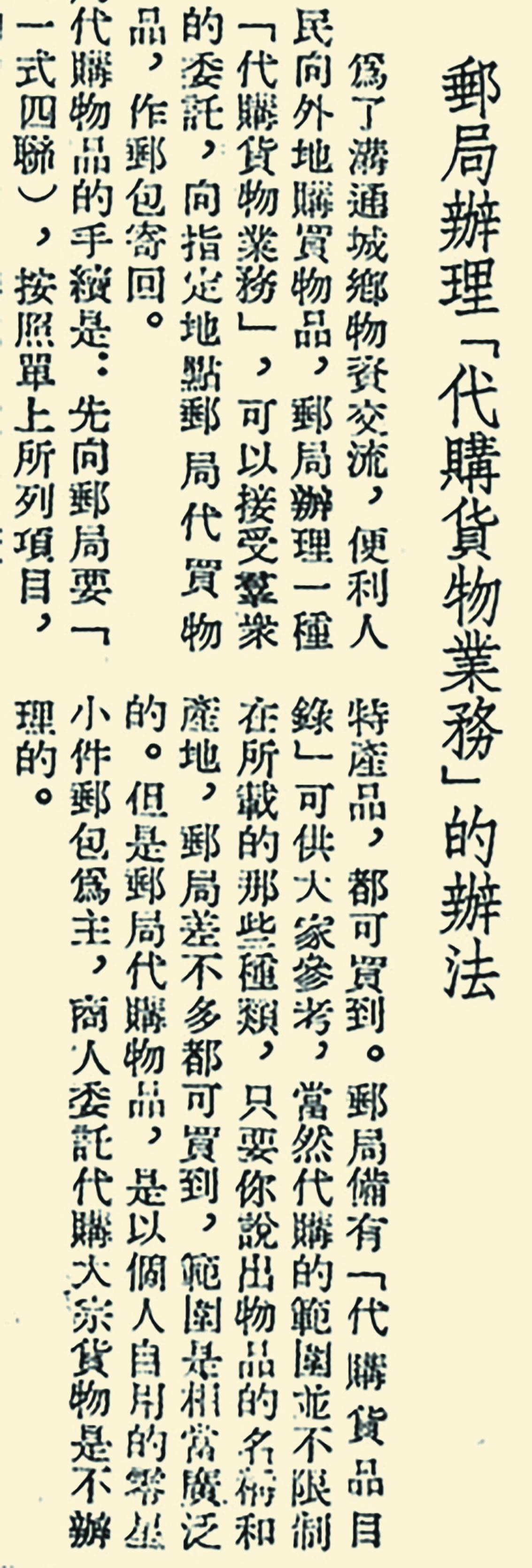 那个年代,为了方便人们从外地购买物品,邮局开通了“代购货物业务”,也就是接受群众委托,从指定地点邮局代买物品,然后作邮包寄回。因为邮政机构遍布全国,所以人们想买西北的毛线、上海的文具、各地土特产品等,大都可以买到。邮局备有“代购货品目录”,即便超出目录范围,只要有物品名称和产地,购买需求也差不多能够满足。(1952年12月28日《北京日报》2版,《邮局办理“代购货物业务”的办法》)