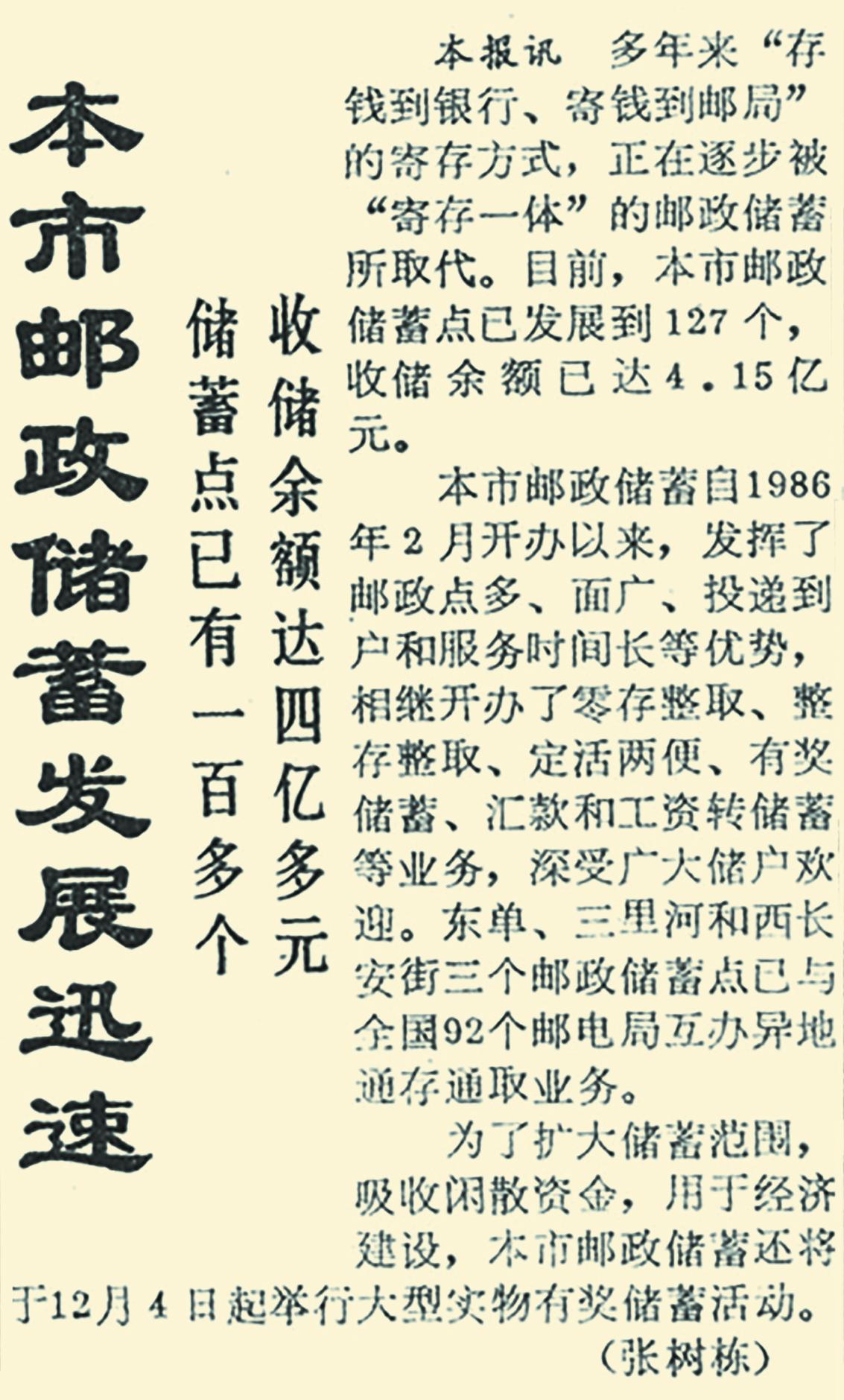1986年,北京开办邮政储蓄业务,从此,“存钱到银行、寄钱到邮局”的传统观念开始改变。