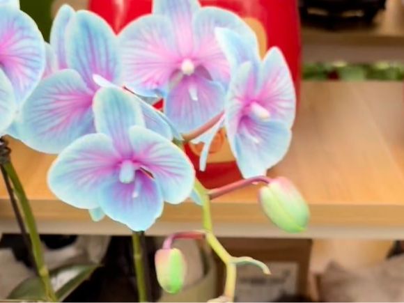 记者走访发现,北京很多花市的摊位都把“C位”留给了吸色花。在做过吸色处理后,蝴蝶兰的颜色变得更亮眼了,有粉、蓝、紫等多个色系。除了去年大火的马卡龙色,今年还有了更特别的颜色,比如,“星空”是蓝紫交融的,“梦幻”是粉橙双色的,好像两种油彩混合在一起,但又没有完全融合时的样子。