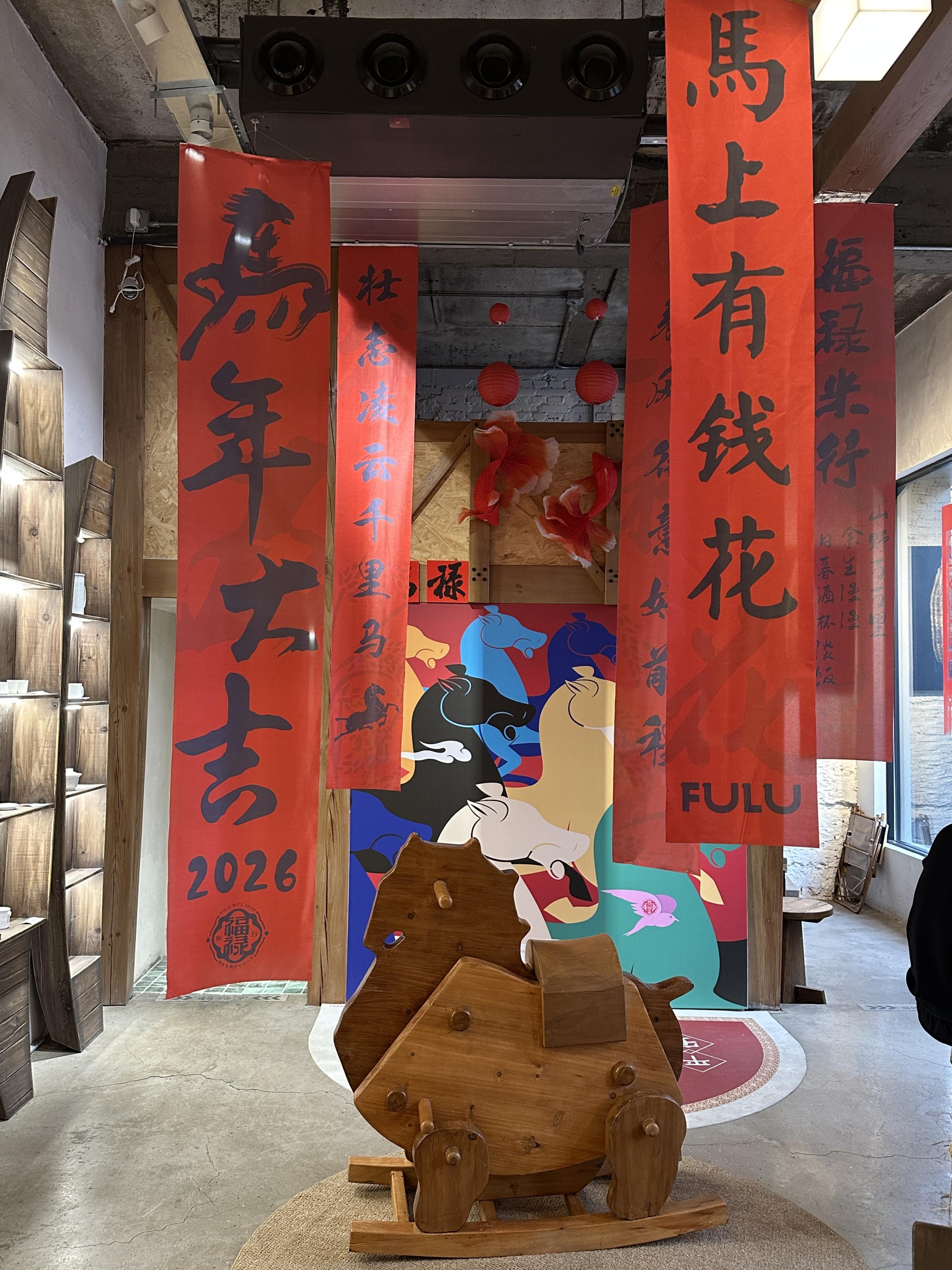 禄米仓胡同的几家咖啡小店,也换上了新春装扮。一家以“米仓”为主题的小店,大幅“金马送福”主题的红剪纸装点门楣,店内,巨幅春联搭配纯手工制作的木质“摇摇马”,打造成了一个专供顾客打卡拍照的区域。“我们早早布置,想让大家提前感受过年的氛围。从元旦开始,就有好多顾客穿着喜庆的服装,来这儿排队拍照打卡呢!”店员欣喜地说。