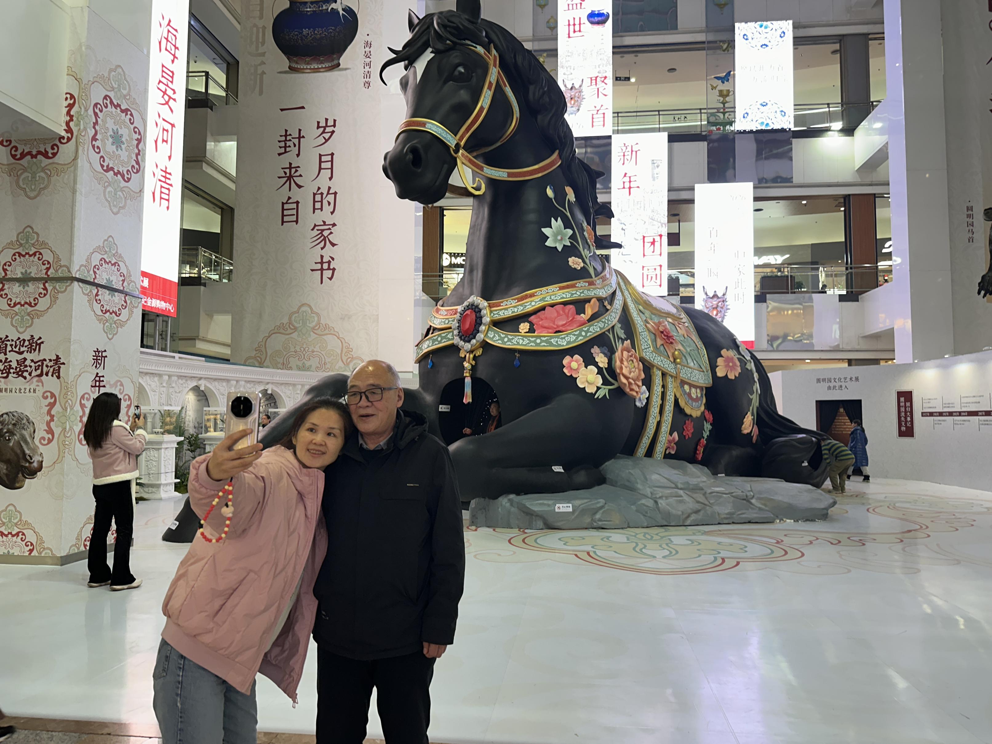 “哇!妈妈,这匹黑马真帅,快给我拍张照。”在世纪金源购物中心商场二层中庭,一尊16米长、3层楼高的黑色巨马艺术装置,瞬间抓住过往行人的目光,大家纷纷停下拍照打卡。这里正在举办“兽首迎新 海晏河清——圆明园文化艺术展”,这尊巨马以圆明园马首铜像为设计灵感,又融入清代宫廷画《乾隆大阅图》中的英武气韵,沉稳大气又不失灵动。