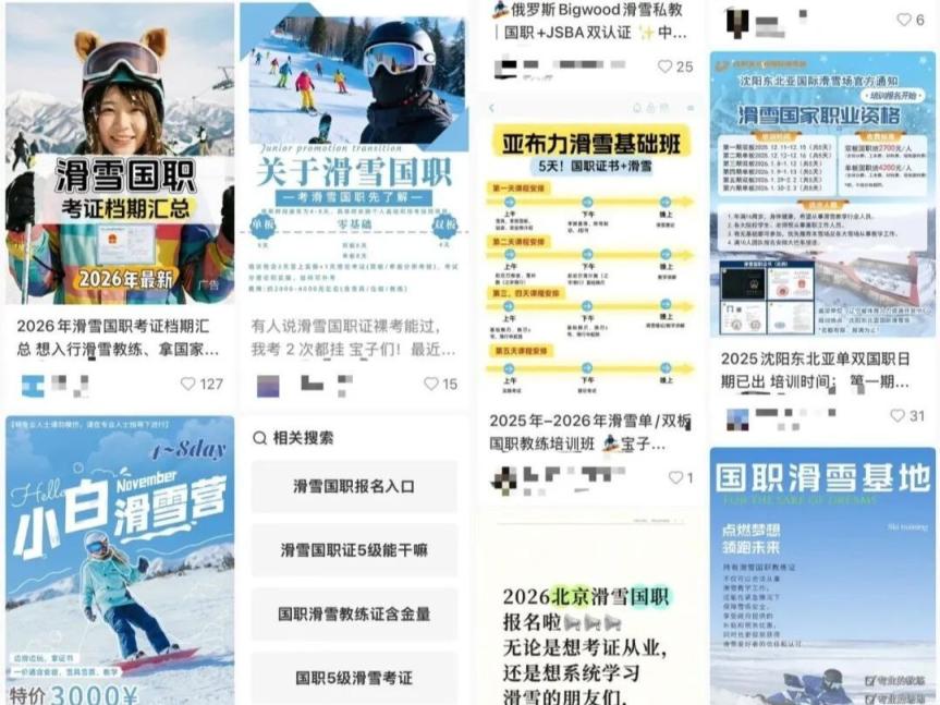 培训和考试,串起了获得资格证书完整流程的两端。记者在社交媒体平台搜索发现,一些培训机构或招生代理宣传的“滑雪教练国职证”培训班,普遍是针对学员考取“滑雪社会体育指导员(五级)国家职业资格证书”开设的,培训分为单板、双板,时间通常为5-7天,地点覆盖全国多地的雪场,价格3000元-7000元不等,培训结束后直接参加考试。
