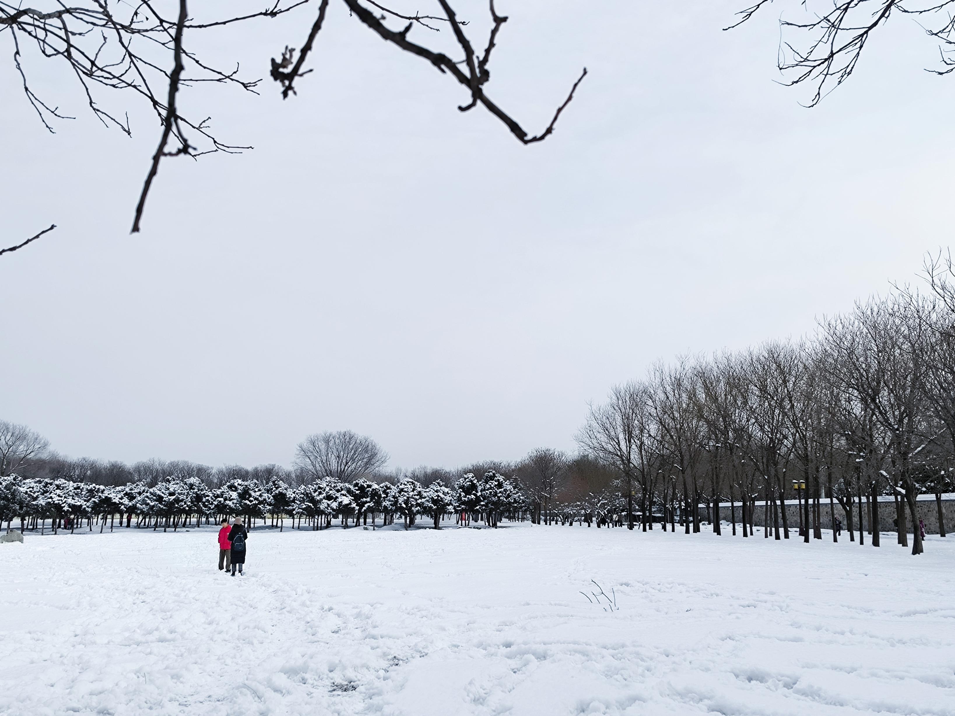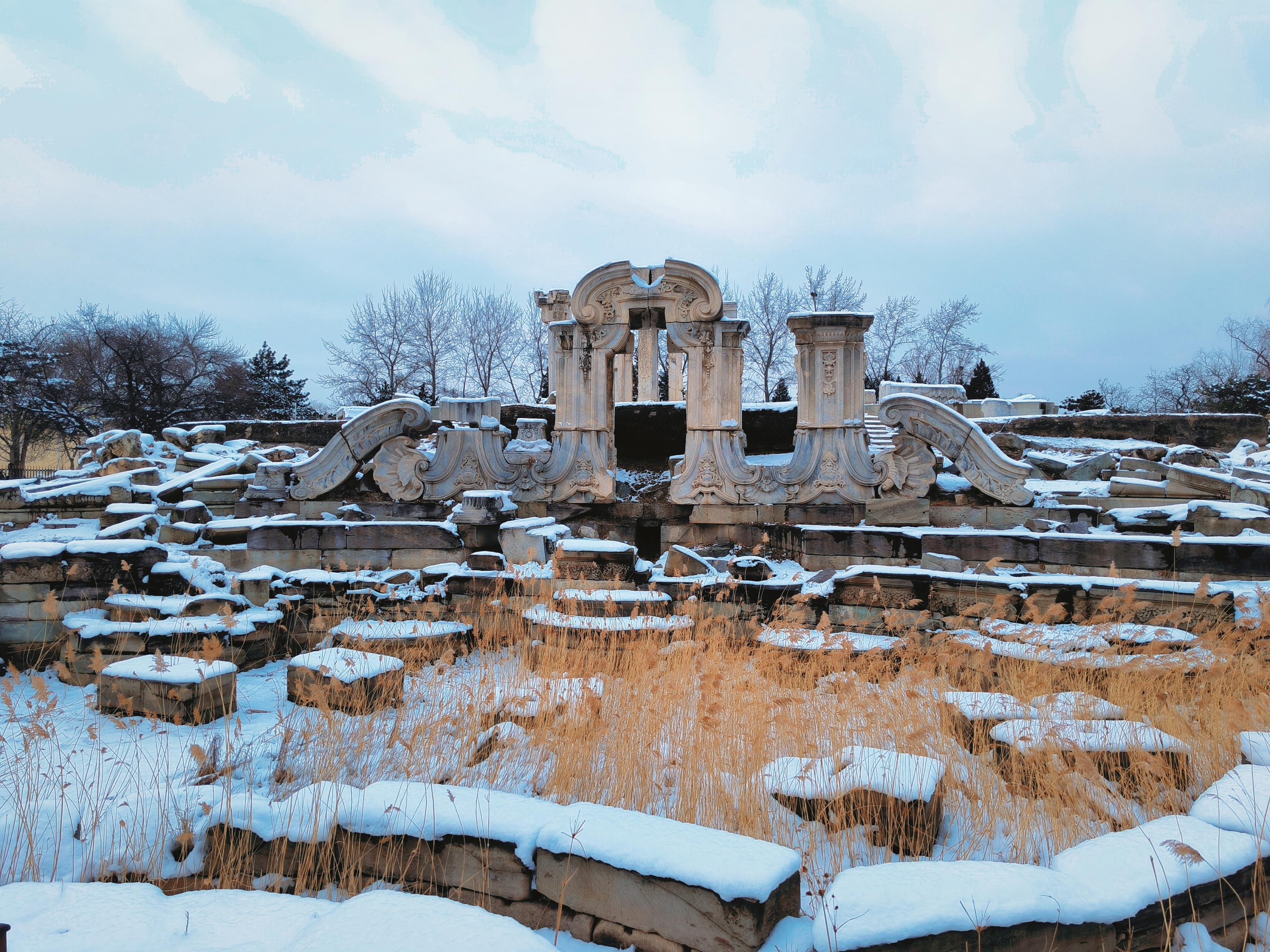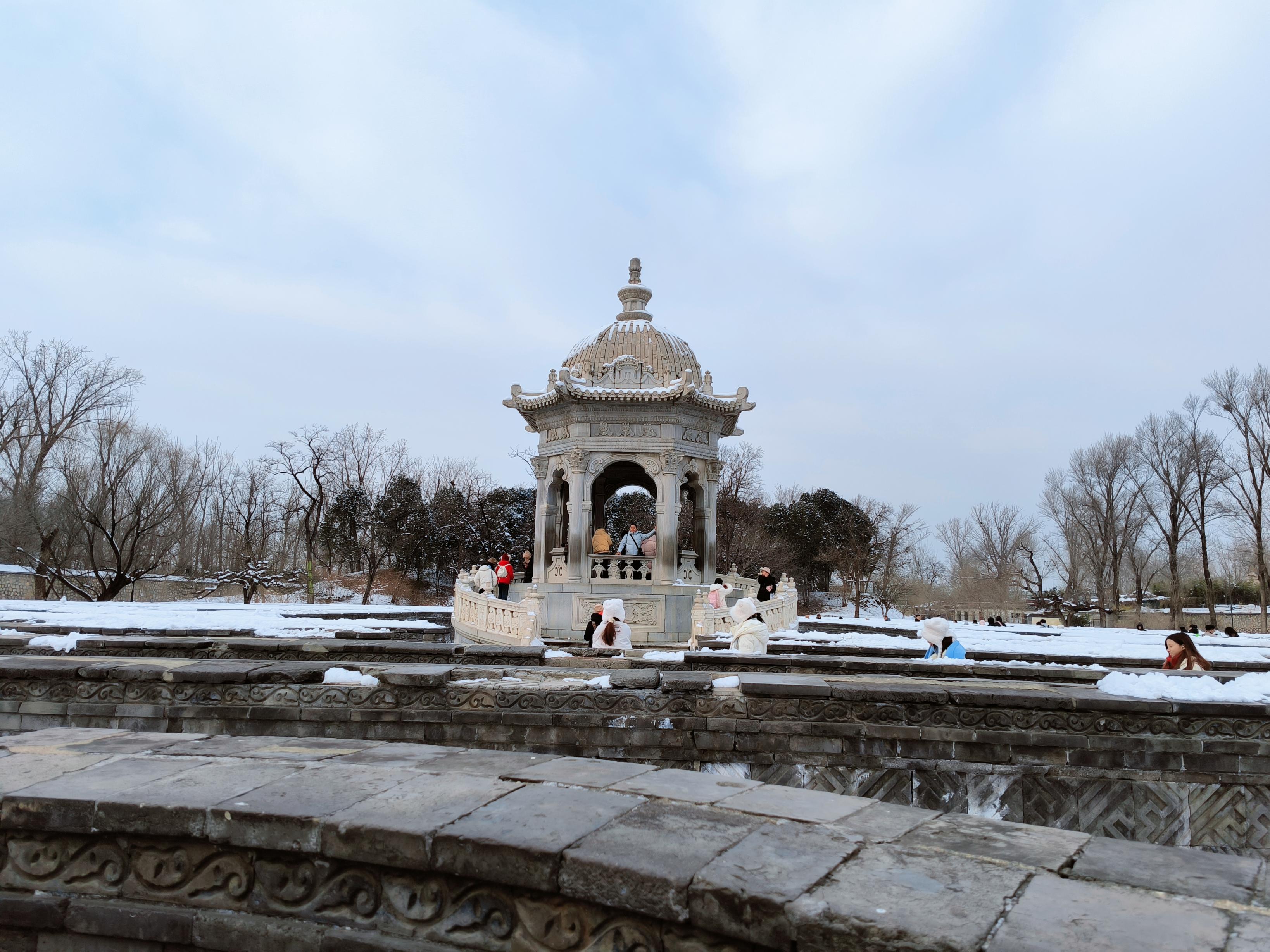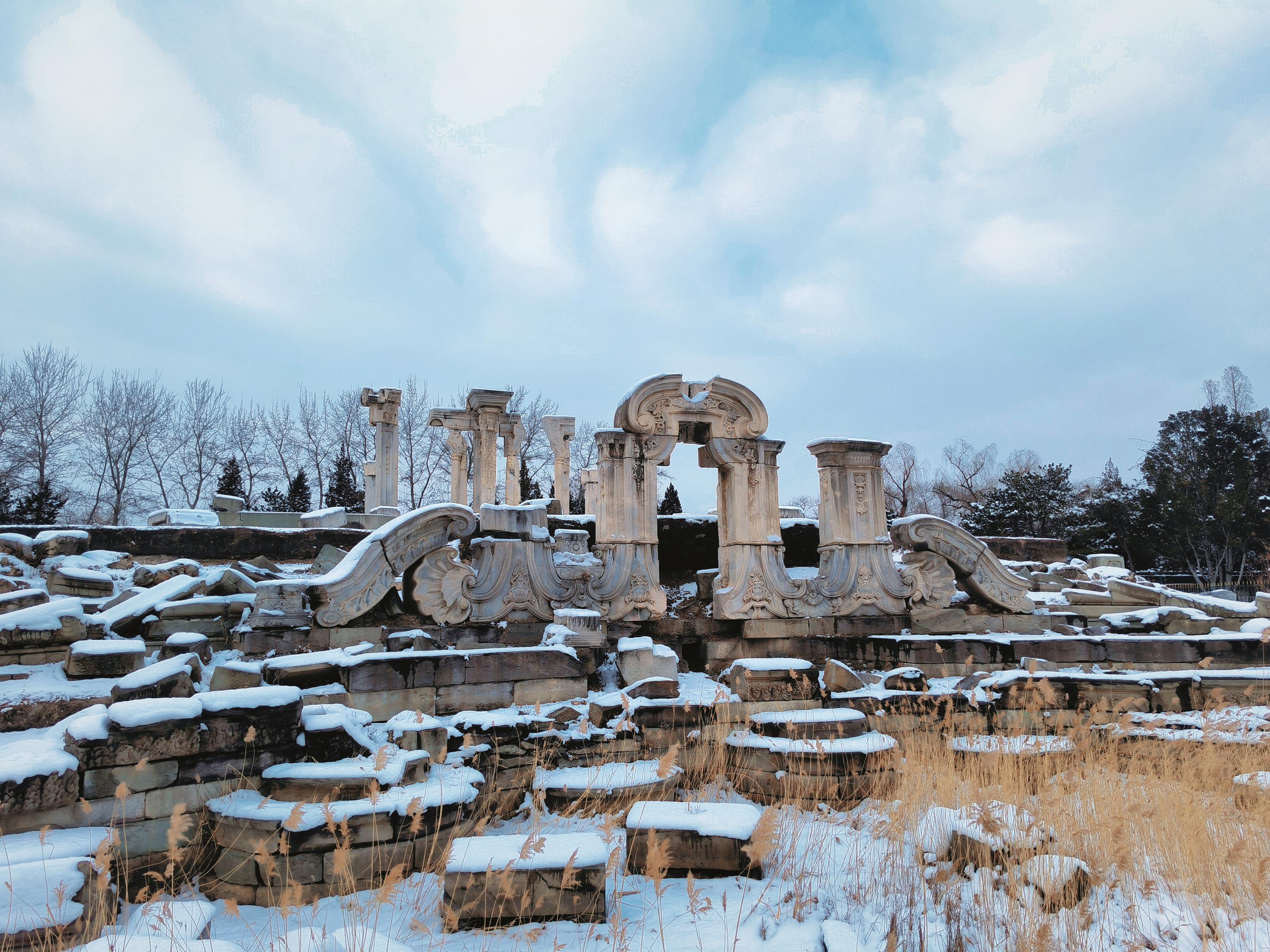 2026年1月18日,北京迎来降雪。圆明园遗址公园内雪花纷飞,西洋楼遗址、福海等主要景点均披上银装。不少游客入园,拍摄雪后园林景观。