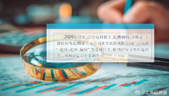 此案并非孤例。据统计,2026年以来,已有电科数字、杭萧钢构、亚辉龙、天普股份等近20家上市公司及其高管或股东因信息披露“抢报、迟报、漏报”等违规行为,收到沪深交易所监管警示或被证监会立案调查。