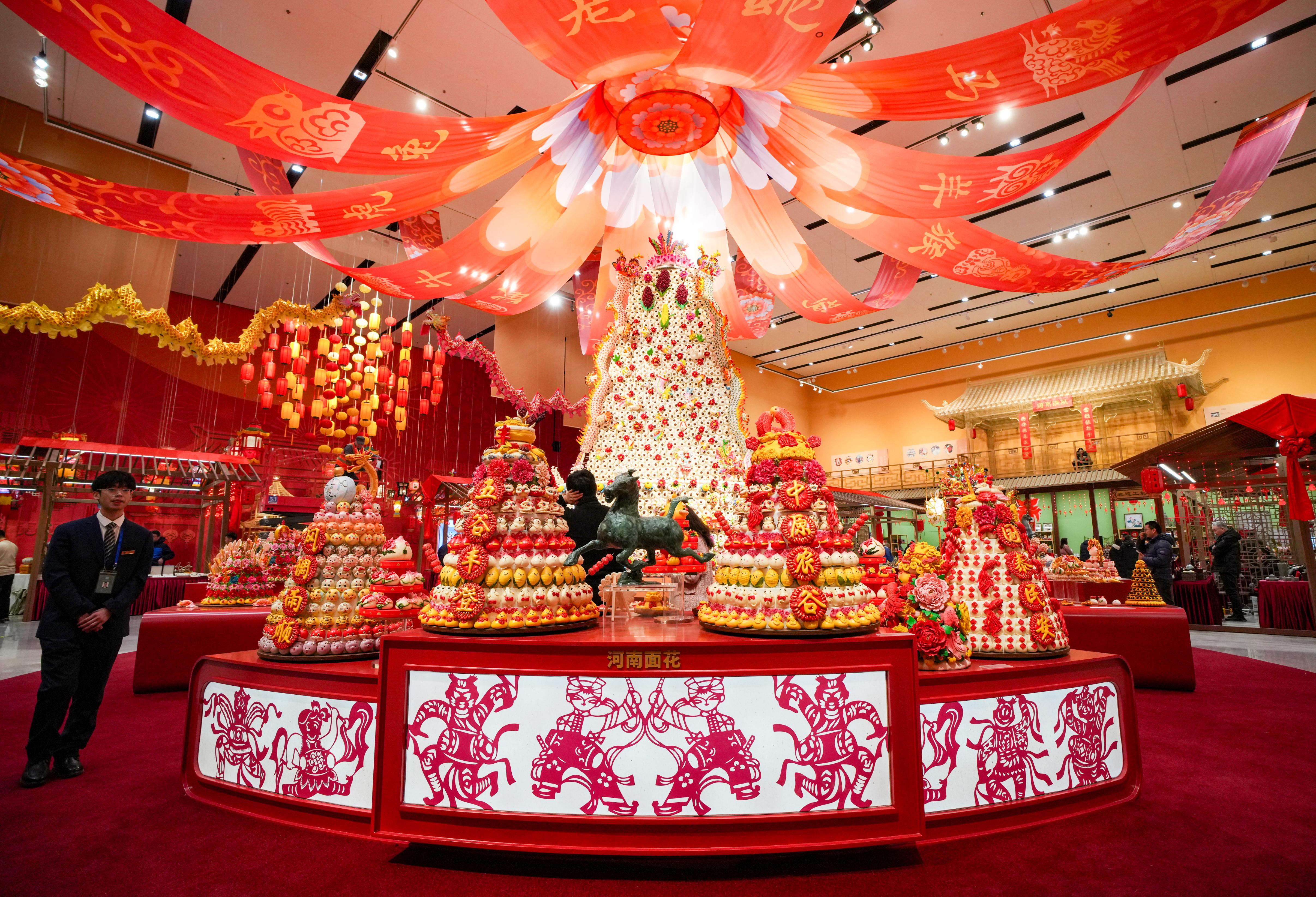 在“食为天”展区,一座高4.5米、直径3.6米的花馍“大鼓枣山”引来观众驻足惊叹。这件来自陕西省澄城县红云花馍农民合作社的花馍作品,以“大鼓为基、枣山为魂、龙凤为顶、百花簇拥”,还融入了花卉、生肖等丰富元素。合作社社长惠相楼说,这件作品由18人做了一个月才完成,“我的婆姨、妹妹、女儿都参与了制作。”该展区以“五谷为本”“食以养人”等中国人的粮食观为线索,集中展示各地非遗美食,使观众体验感受春节与粮食安全可持续发展之间的密切联系。