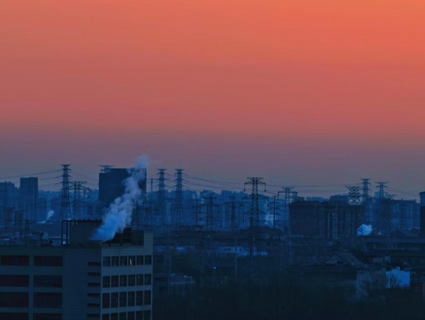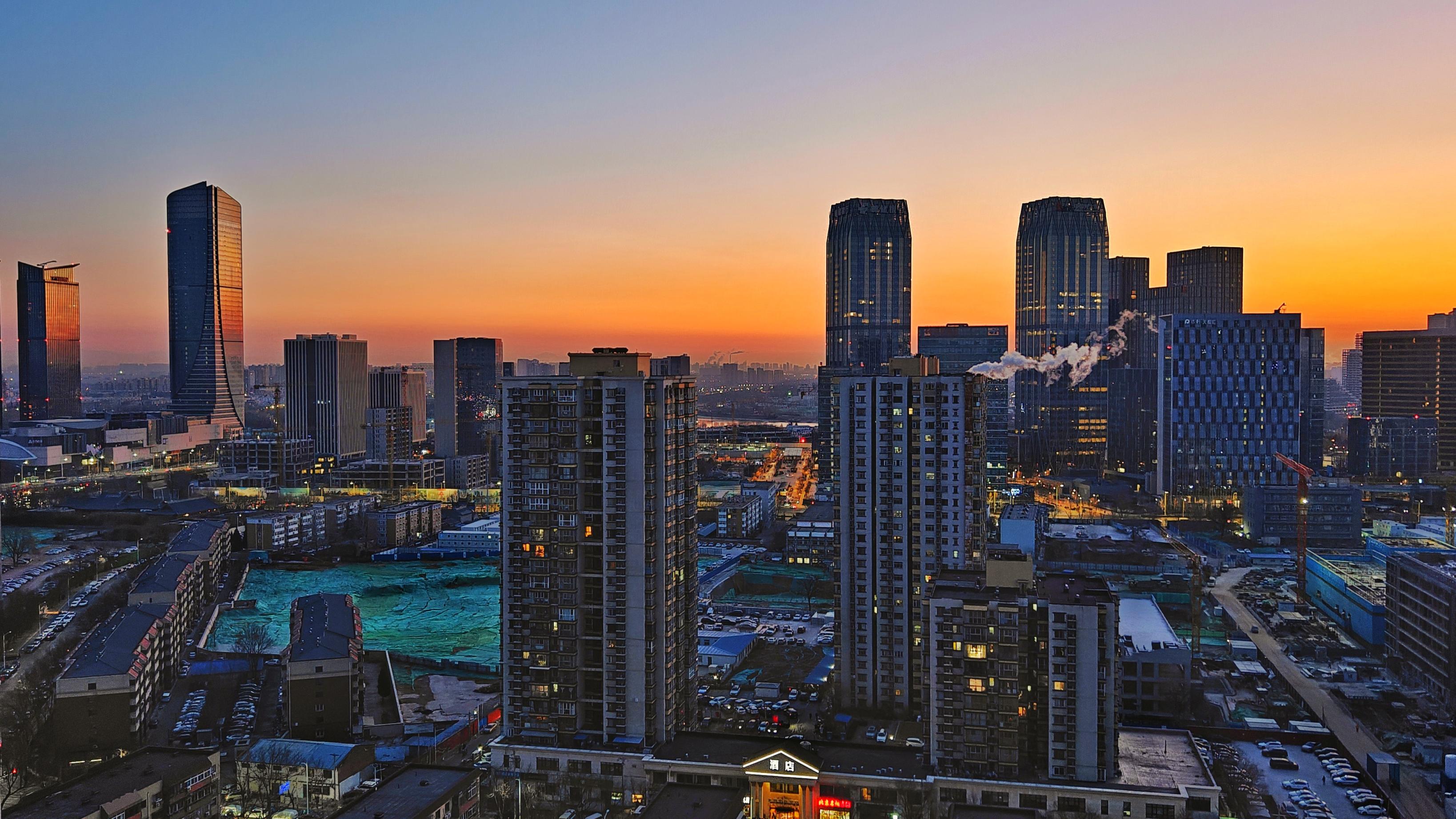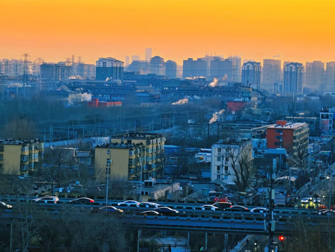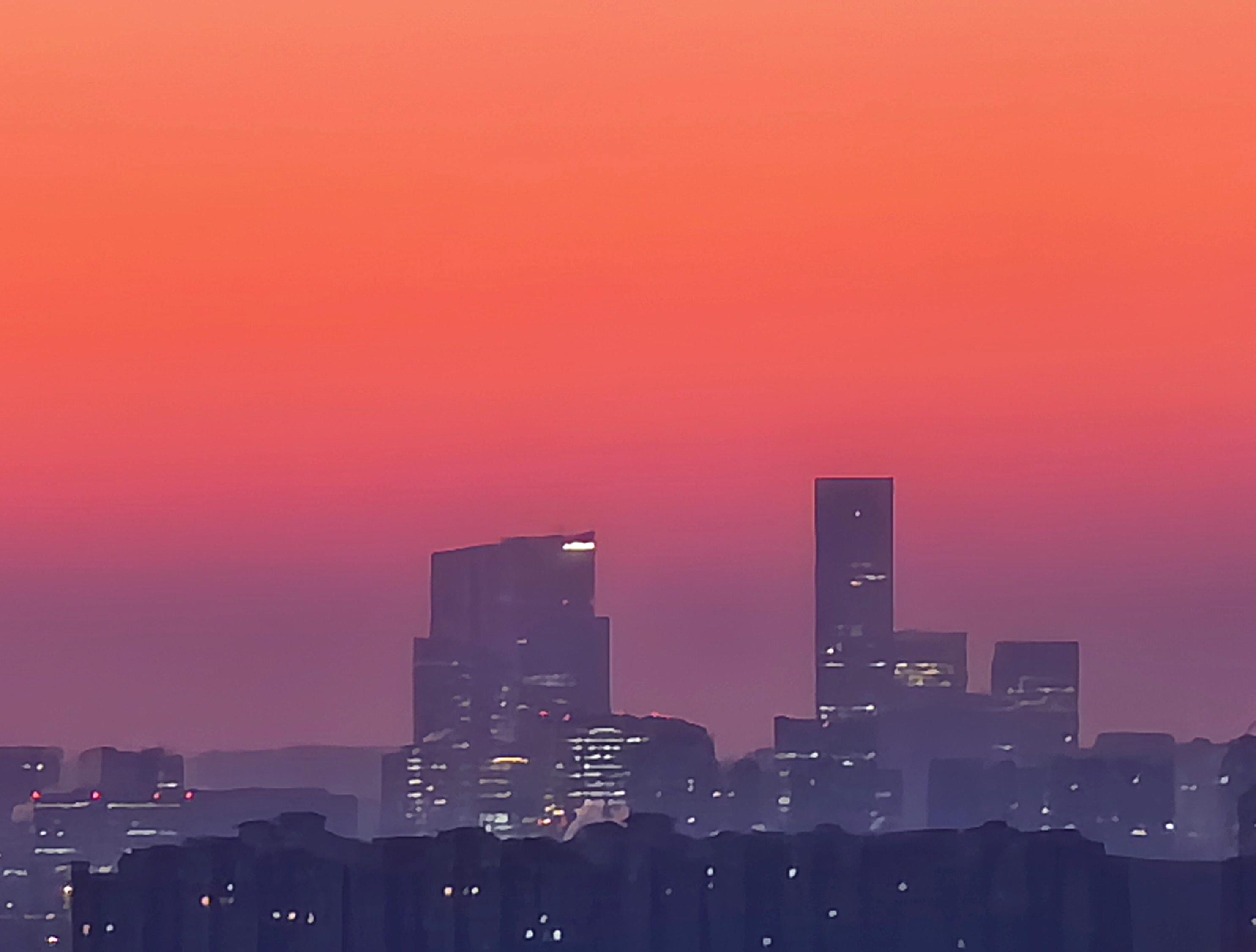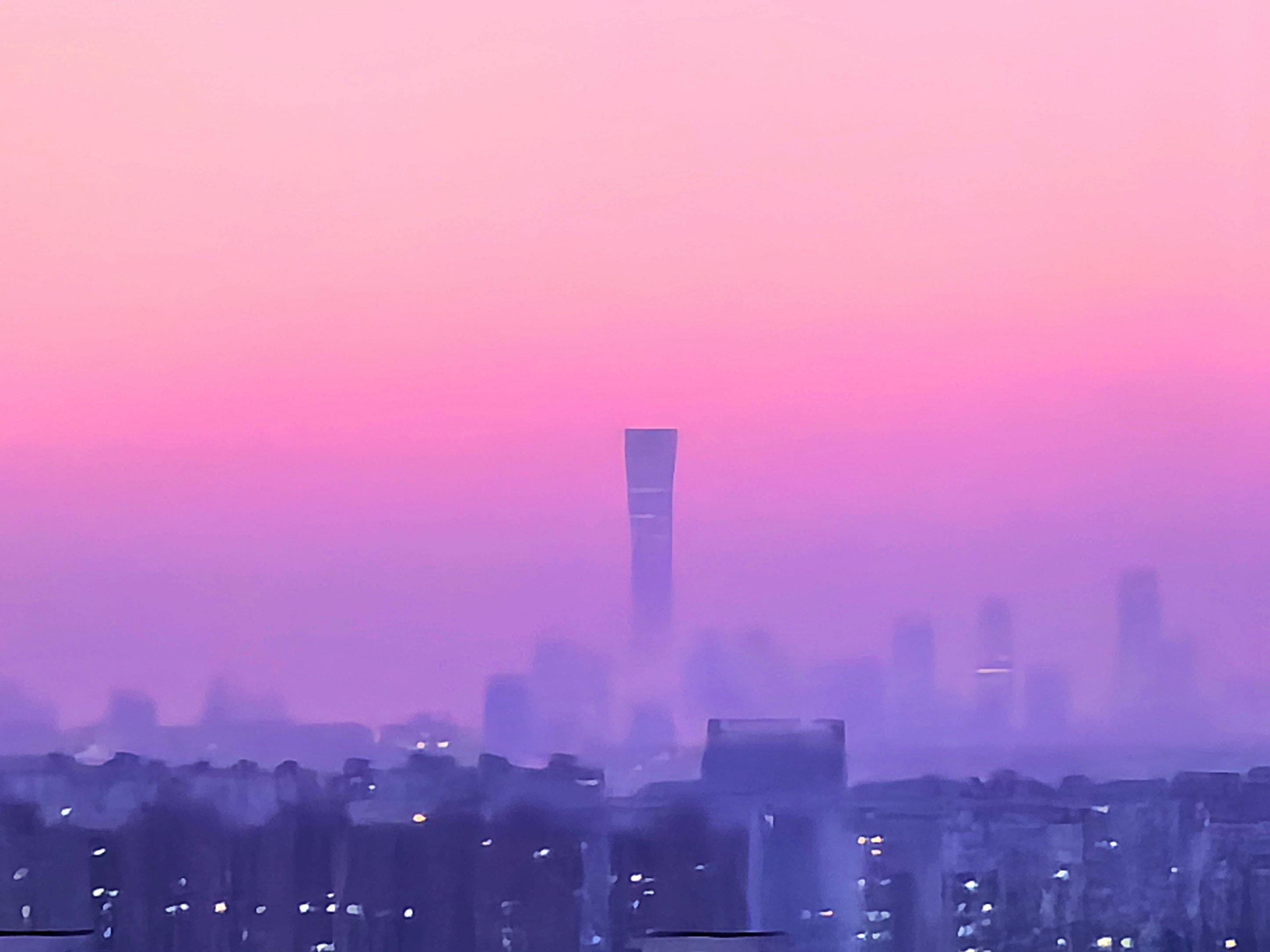 今日清晨,天空像一块巨大的“调色板”。朝霞把天空染成各样的色彩,铺展在北京的天际线上。