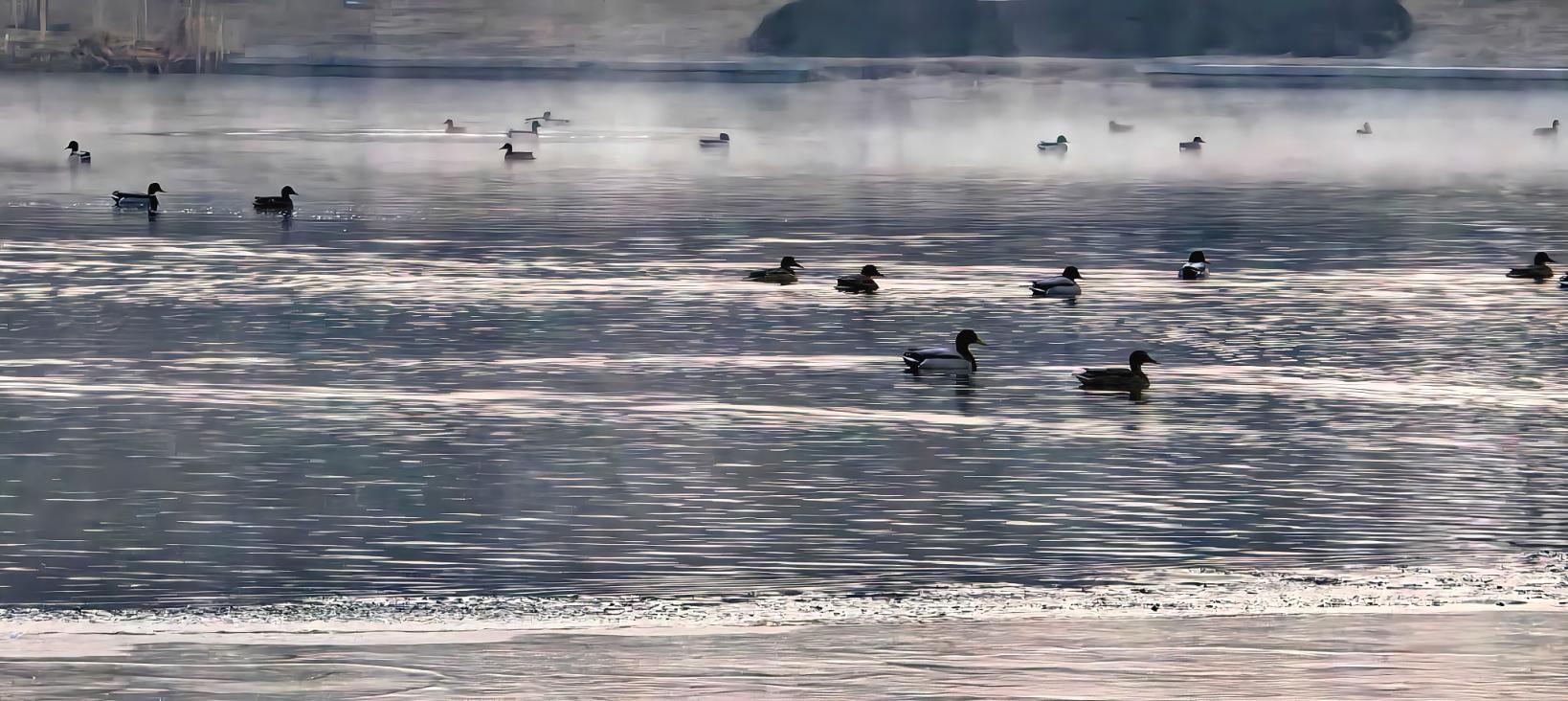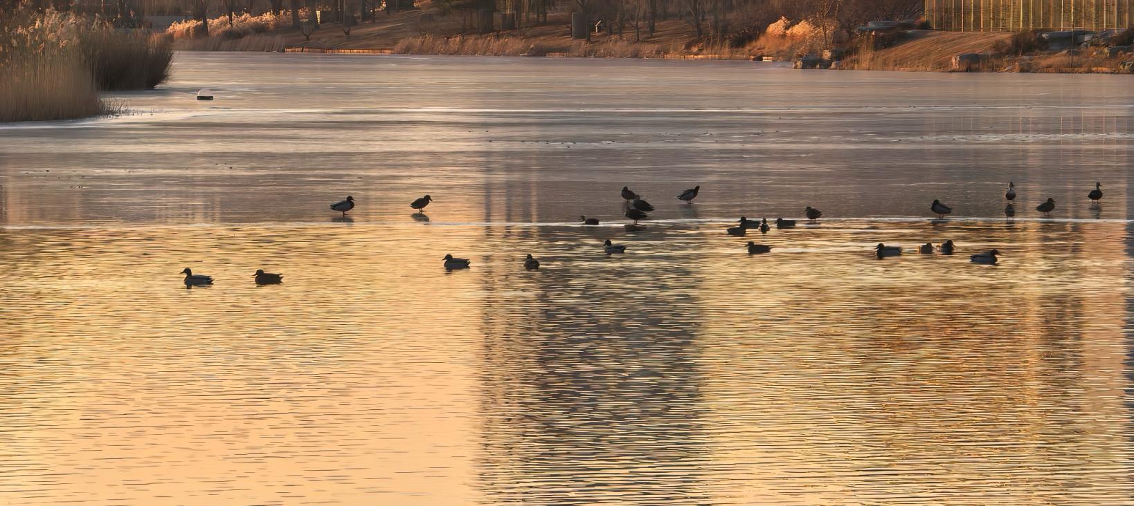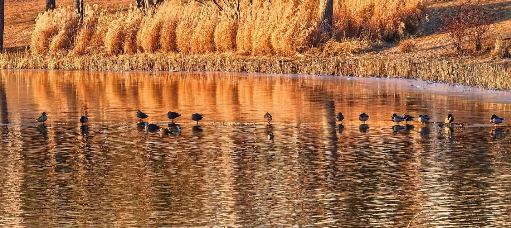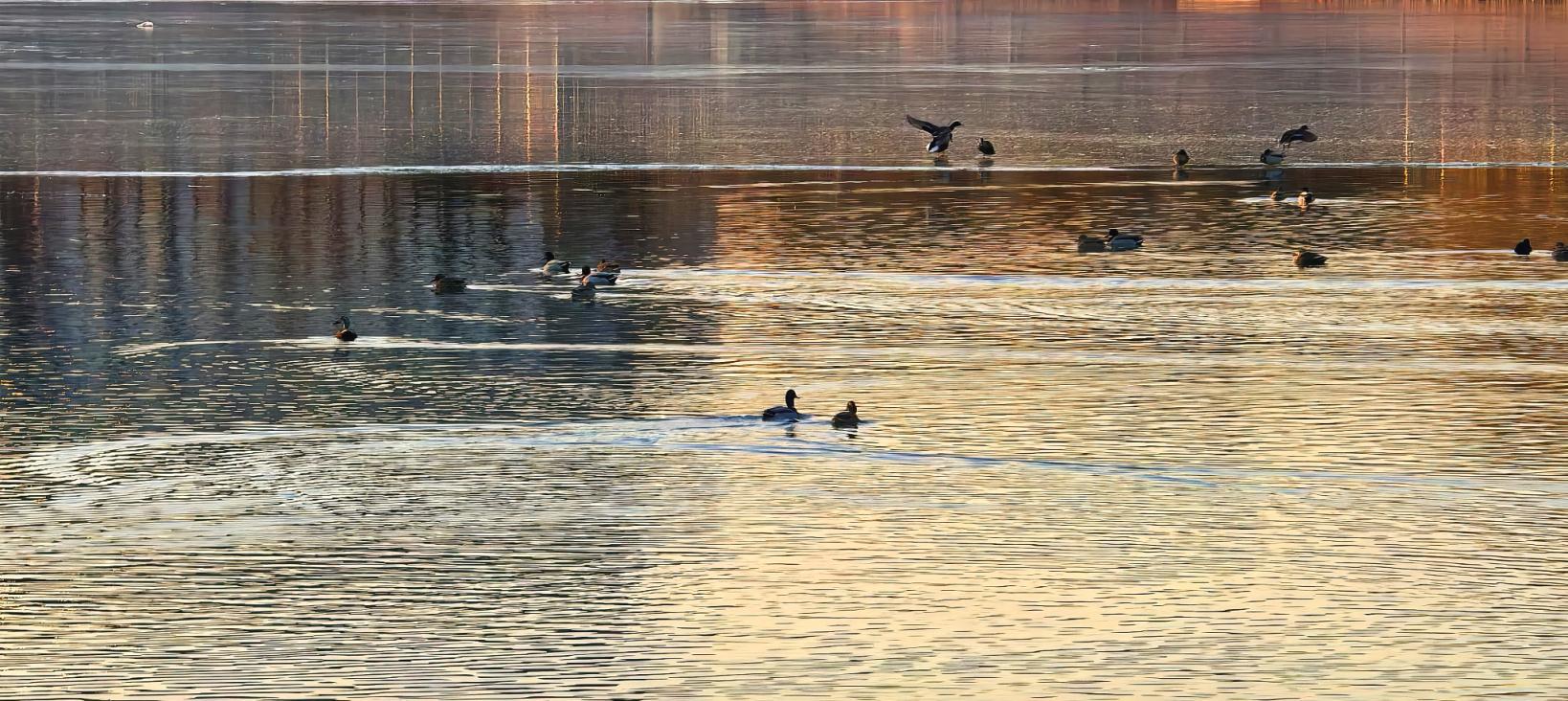 朝阳升起,群鸟冰嬉在通州镜湖上……