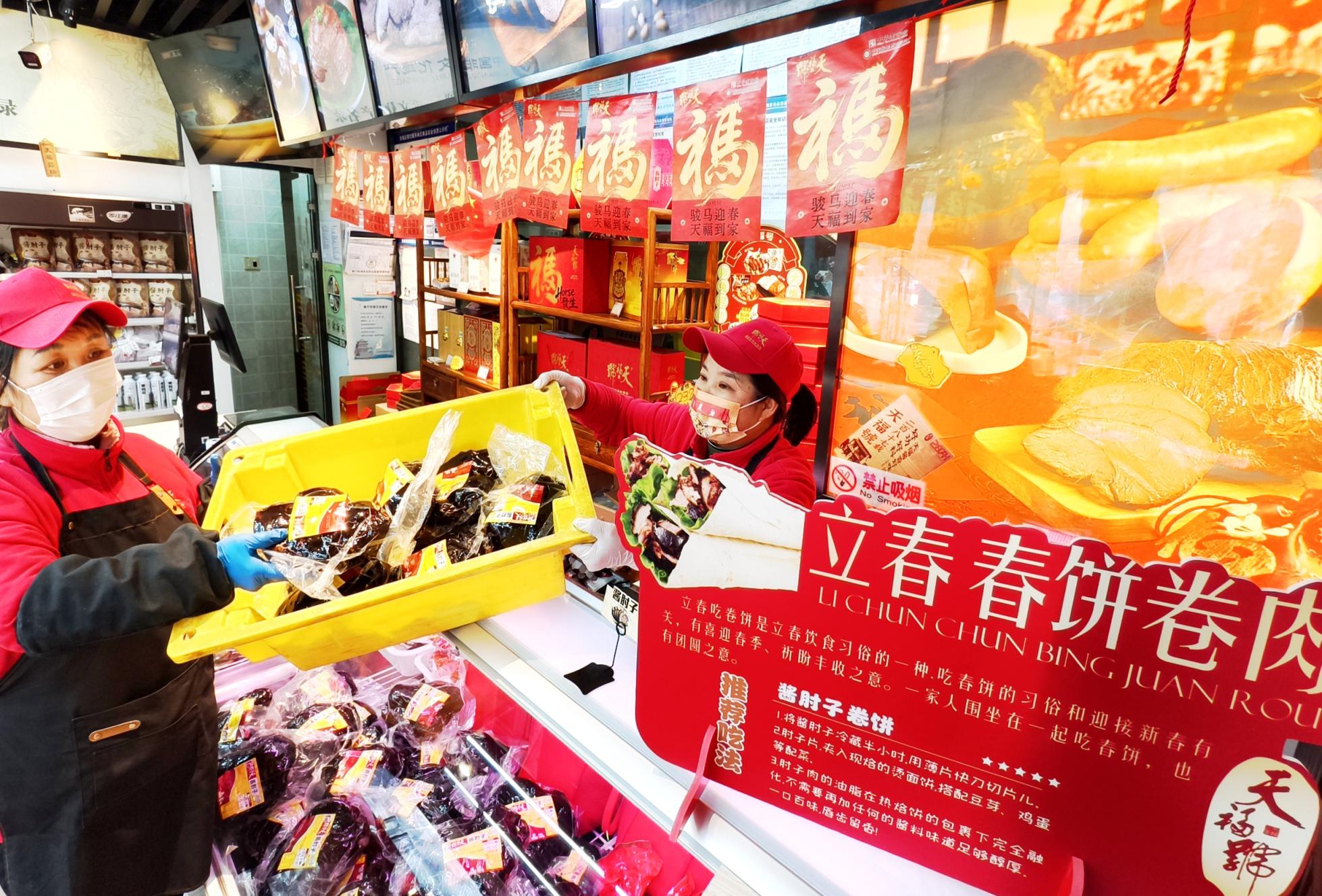 今日立春,老北京“咬春”民俗如约而至,中华老字号天福号迎来新春首个消费高峰,在前门等门店不少市民专程前来选购酱肘子,只为春饼里的那一口非遗滋味。