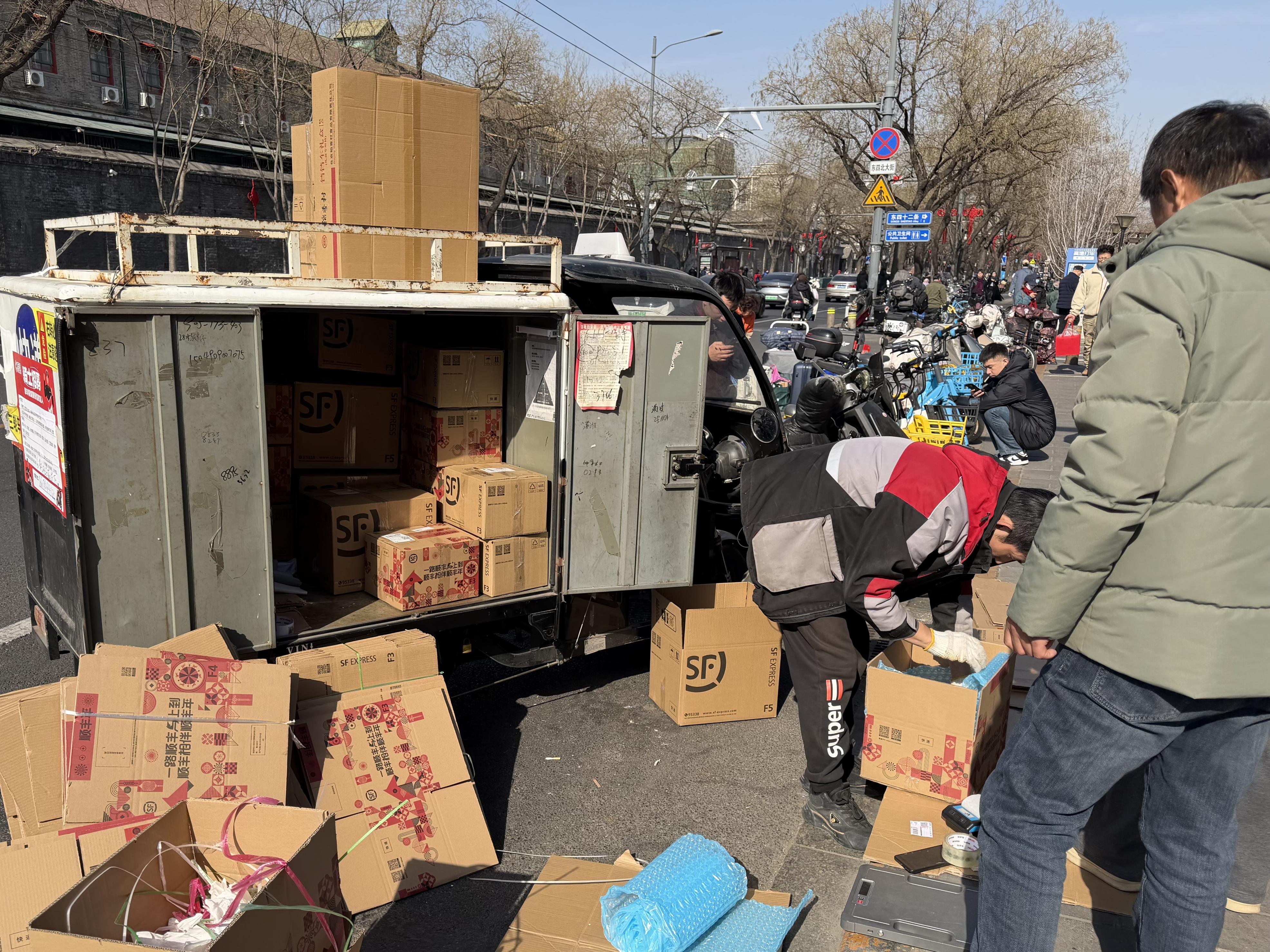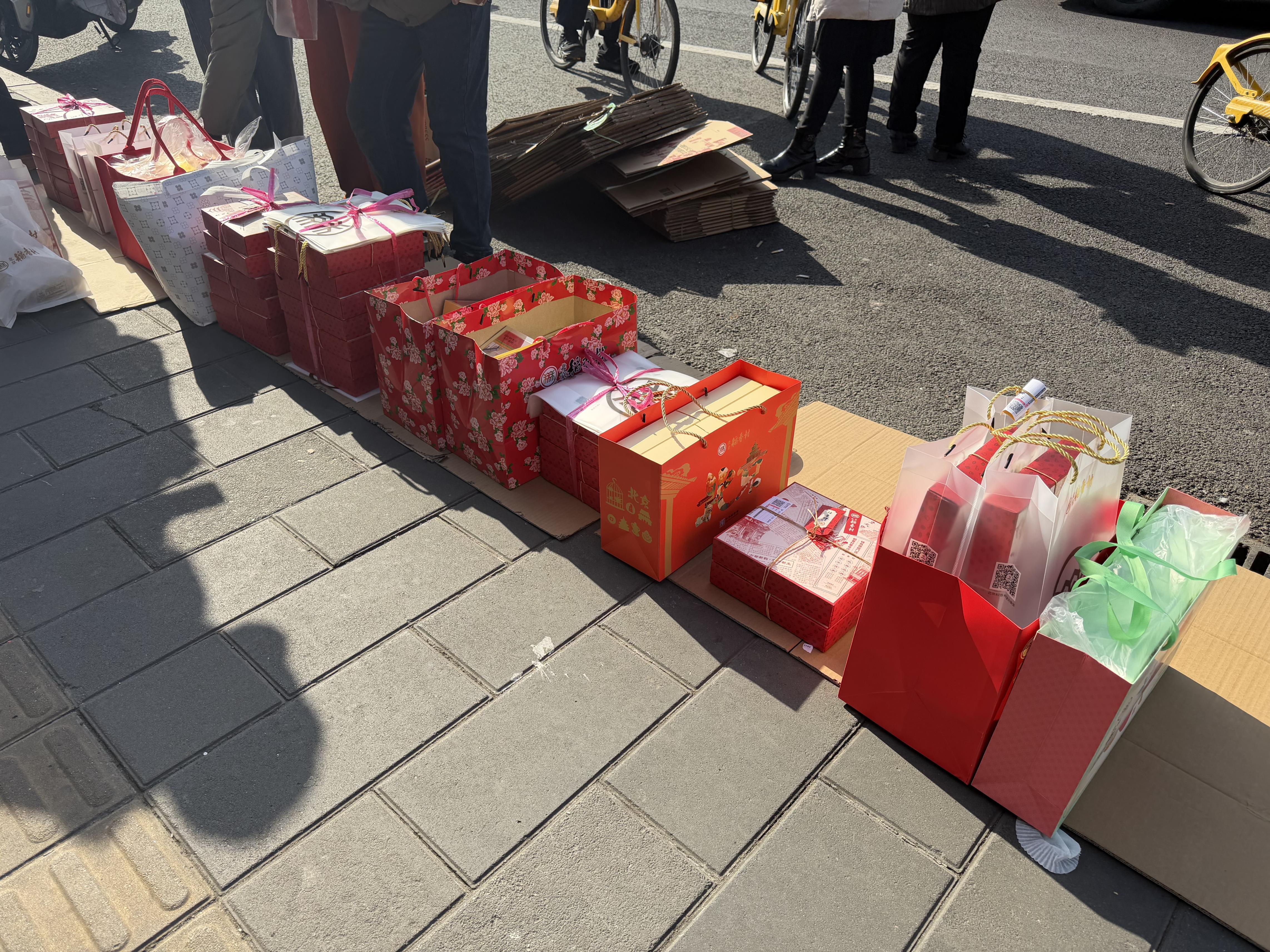 在北京稻香村零号店和第一营业部的门口,还有快递小哥提供打包和邮寄服务。程女士带着女儿买了6盒包装好的点心和一些散装的点心,她选择直接邮寄回江苏老家。“现在单量很大,每天要往返三趟才能把货送完。”快递小哥说。