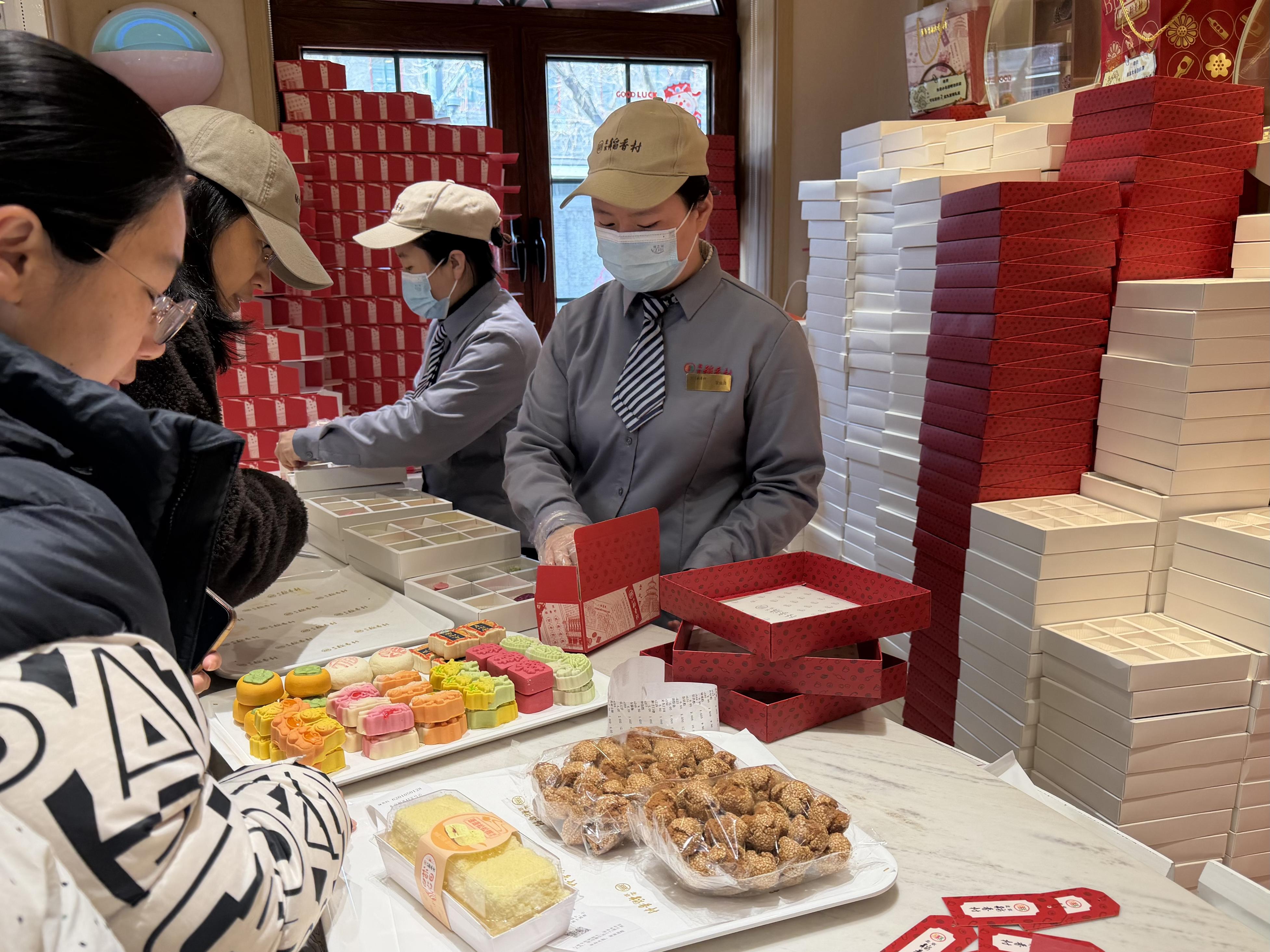 距离零号店不足百米的稻香村第一营业部也同样火爆,每个窗口前都排着四五位等待挑选点心、搭配礼盒的顾客。不同于零号店售卖的“创新款”,第一营业部的商品多是“传统款”。“我下午就要坐车回河北老家了。”一手拎着点心一手拖着行李箱的小李说,“比起零号店的创新点心,我觉得传统点心会更符合长辈们的口味。”