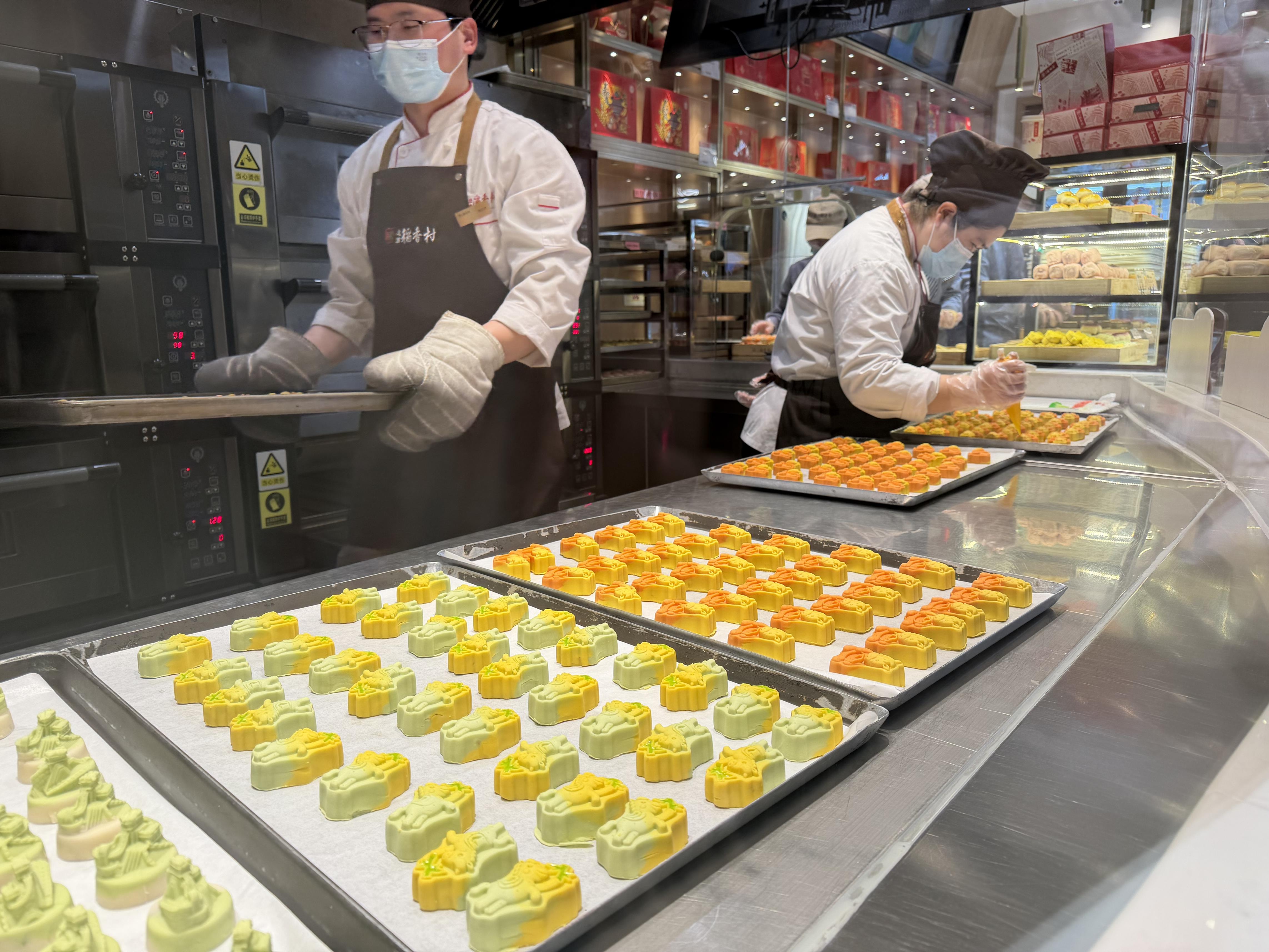 在柜台旁的现烤操作间内,工作人员正有条不紊地进行糕点的烤制和挤裱。今年北京稻香村零号店推出“骏马踏福”系列现烤糕点,卡通小马形象与葫芦、竹子、爱心、元宝图案结合,蕴含了“马上有福”“马上糕升”“马上心动”“马上旺财”的美好寓意。北京市民姚阿姨特意来到零号店挑选新品,“这里的点心颜色丰富好看,适合过年图个好彩头,福气满满。”