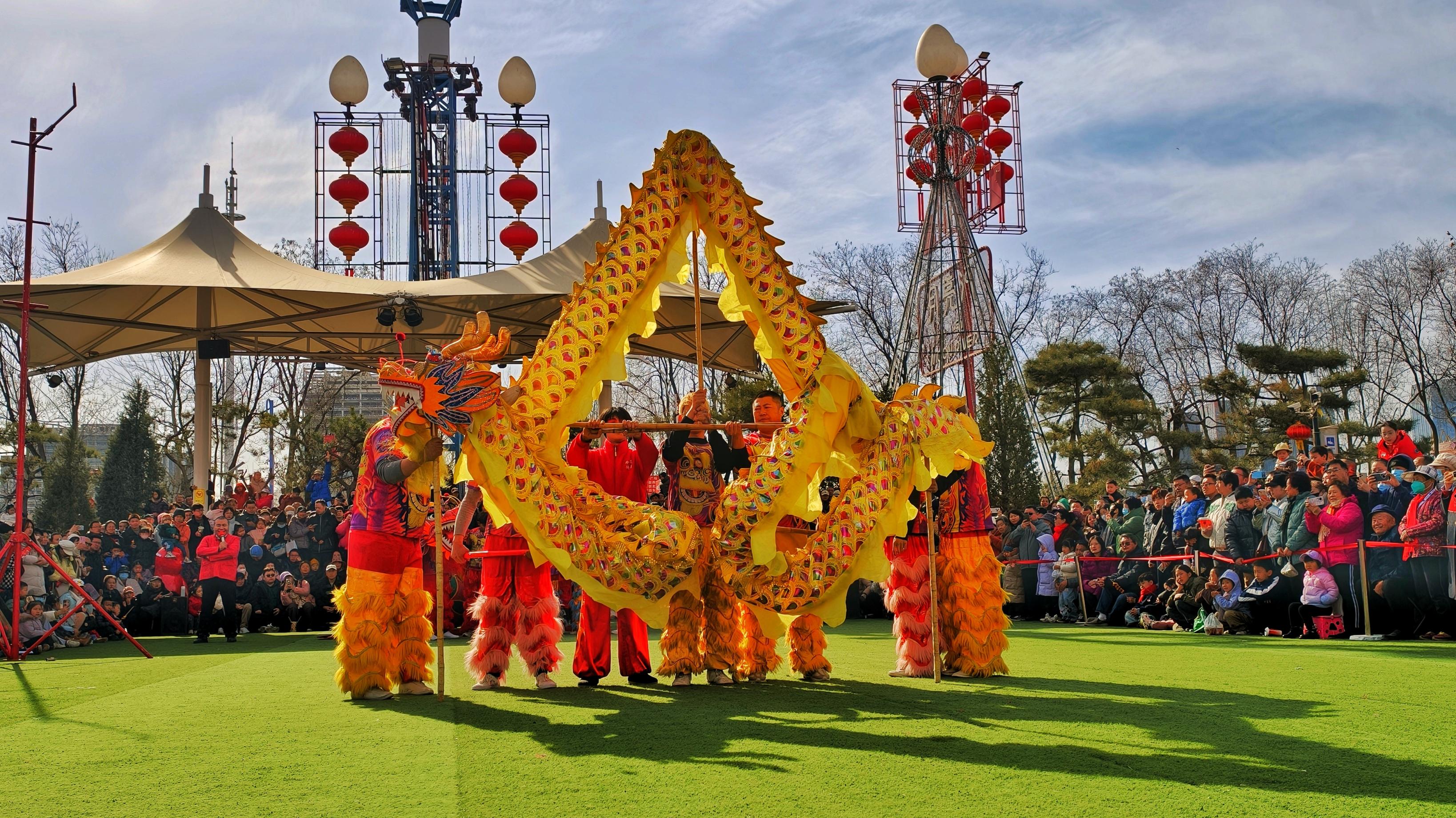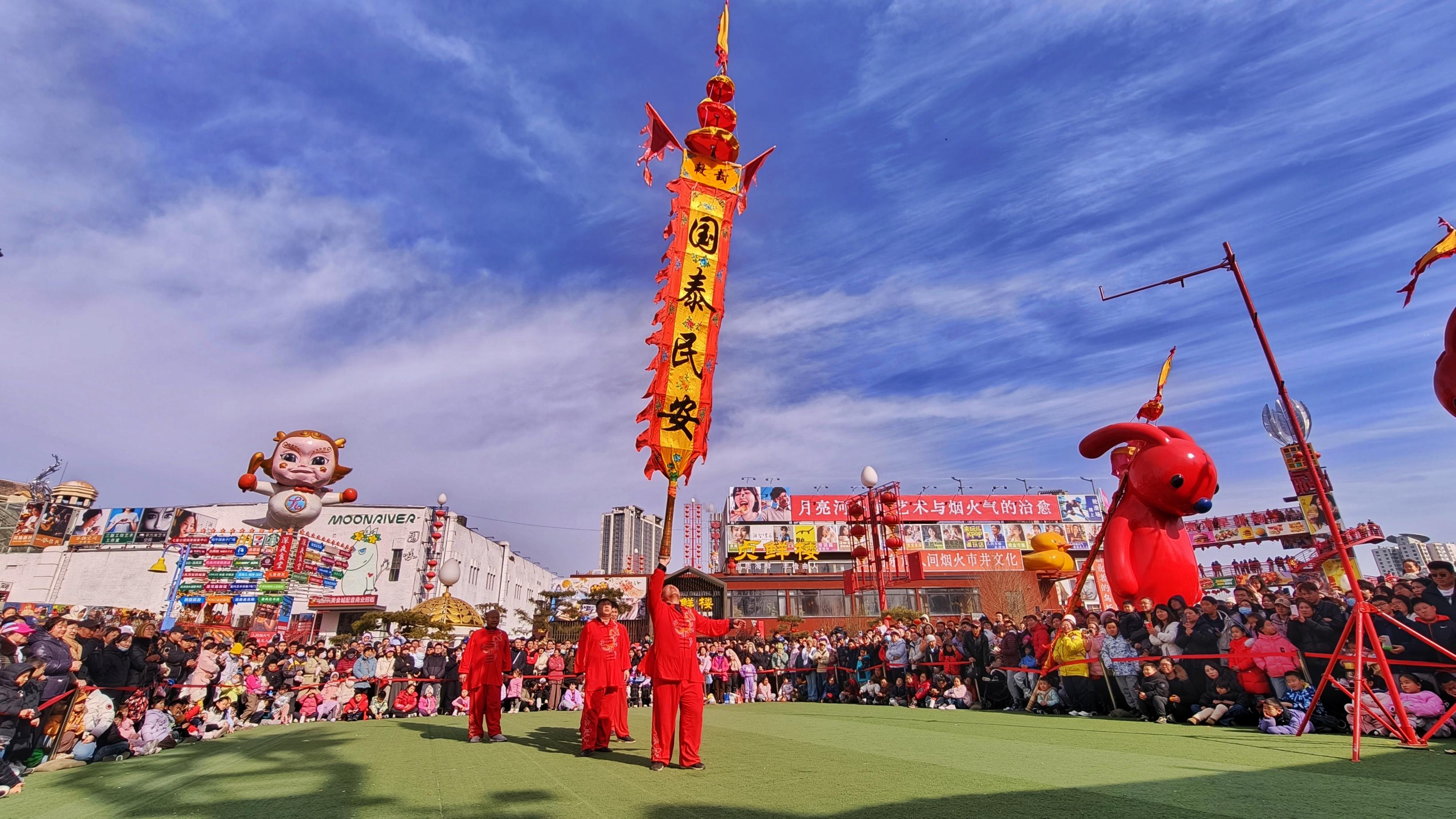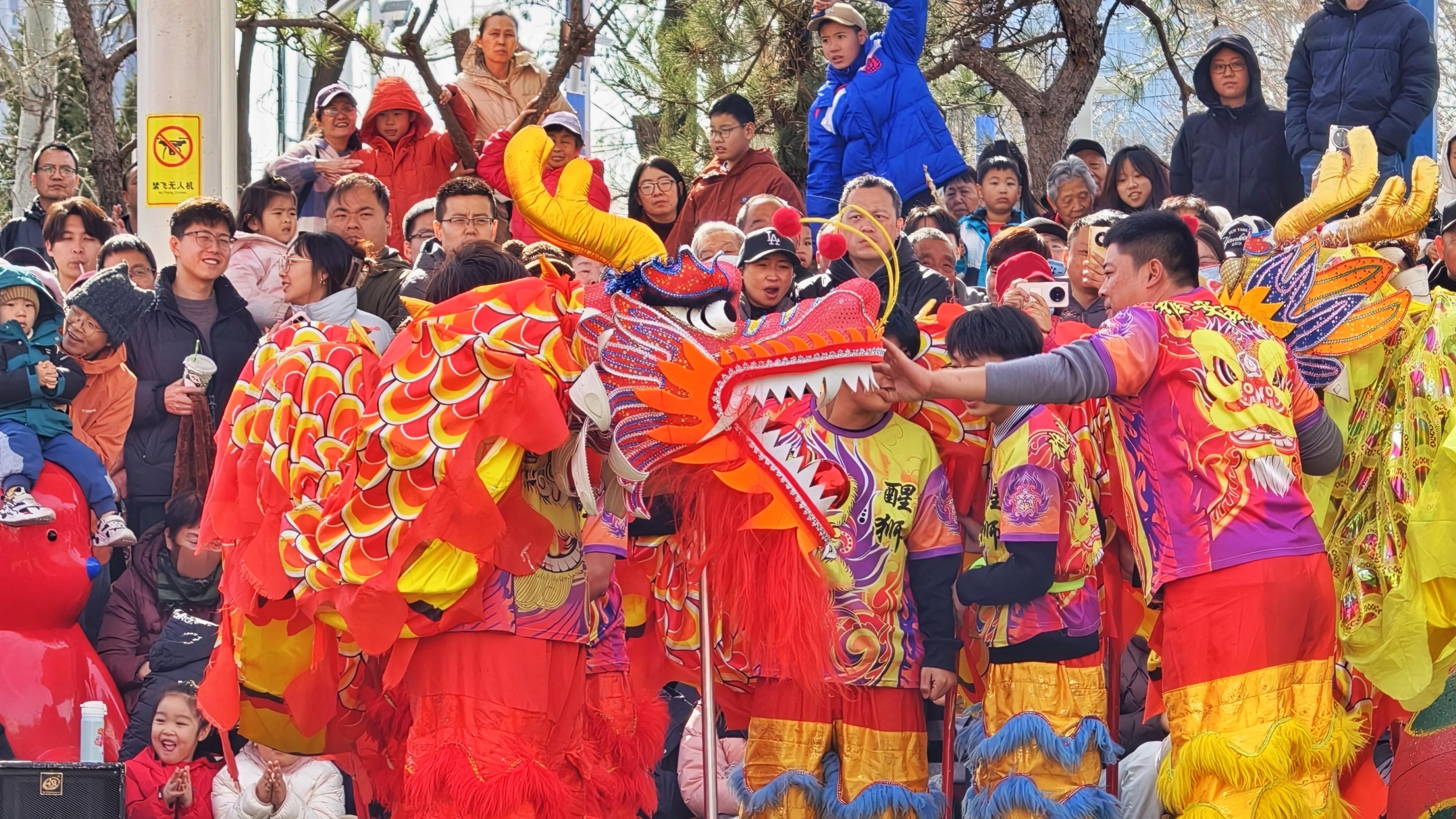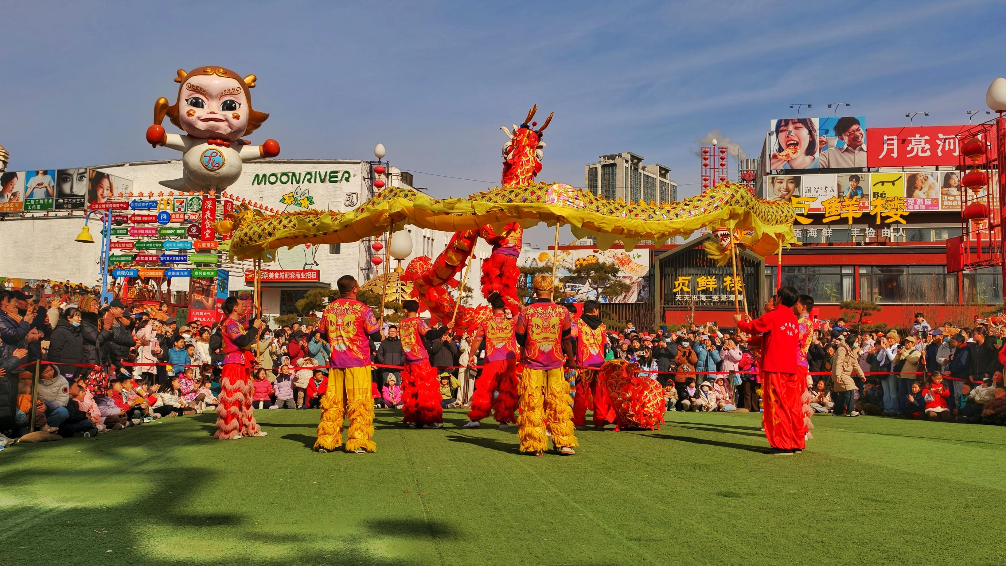 大年初七,通州区月亮河市集,舞龙、舞狮、中幡……精彩上演,红绸翻飞如流霞,人群潮涌成浪。