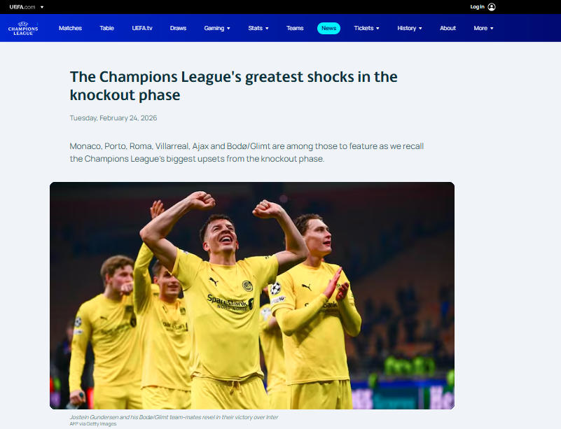 北京时间2月25日凌晨,本赛季欧冠联赛淘汰赛附加赛第二回合开踢。挪威博德闪耀队在客场2比1击败意甲豪门、上赛季亚军国际米兰队,从而以两回合“双杀”对手的成绩晋级16强。