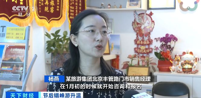 某旅游集团北京丰管路门市销售经理 杨燕:今年中老年错峰游的占比在35%左右,大部分的客人在1月初的时候就开始咨询和报名春节错峰游的一些旅游产品,并且他们更倾向于康养、打卡加经典线路的模式。