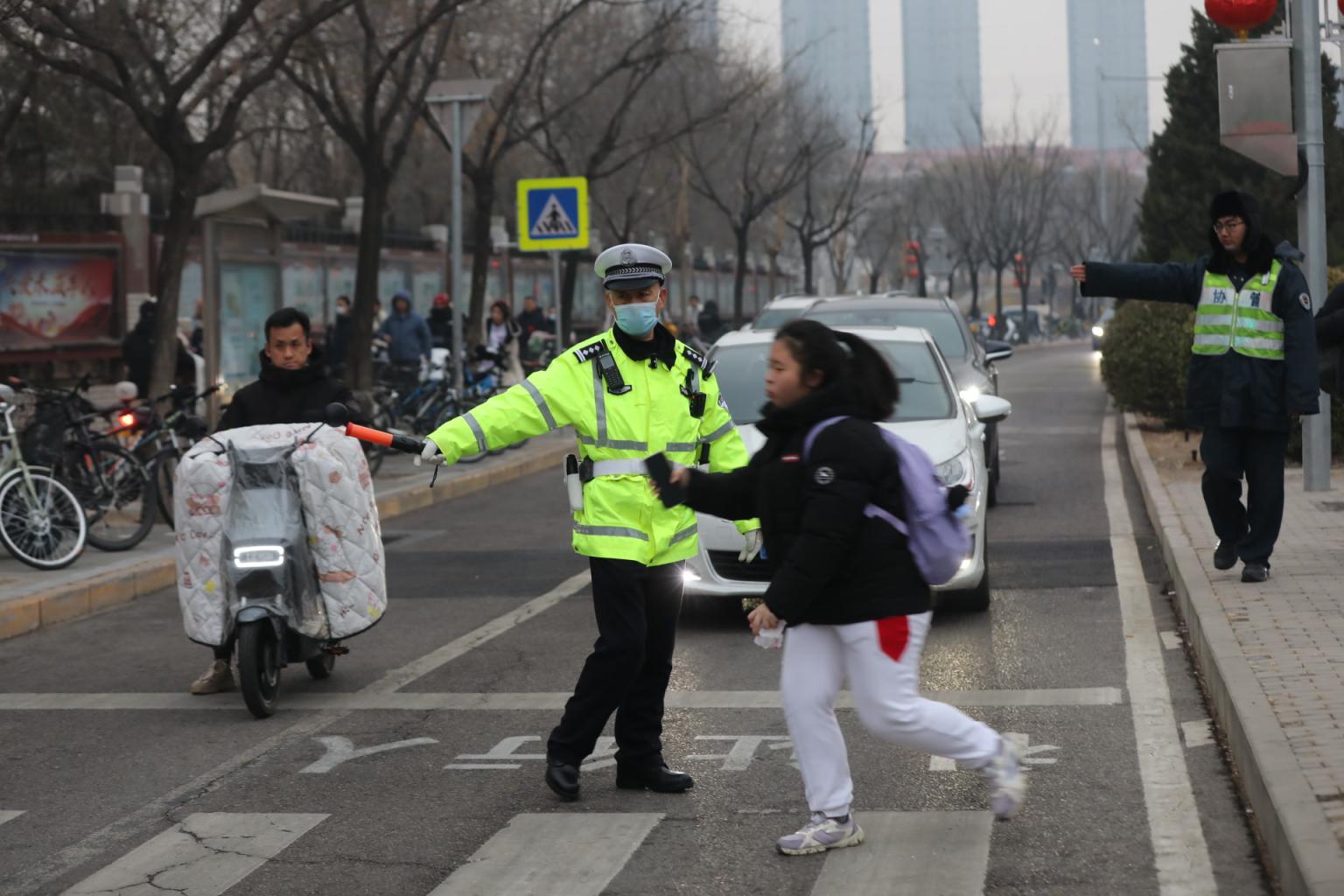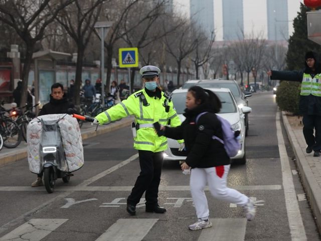 早7点,天色渐亮,记者在人大附中朝阳学校初中部门口看到,校门前的道路已迎来送学车流。在交警和协管员的引导下,送学车辆在最外侧车道有序临时停靠,即停即走,现场虽然车流量大,但井然有序。道路另一侧,执勤民警正专注地观察着路况,适时拦停辅路车辆,引导一批批学生安全通过人行横道。