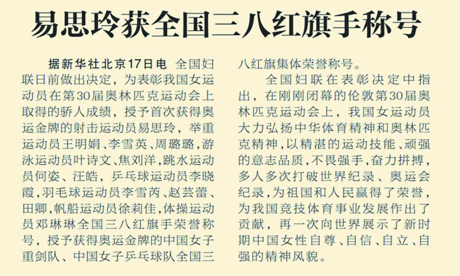 参加奥运会的女运动员们,在赛场上以精湛的技艺和顽强的意志为国争光,展现出自尊、自信、自立、自强的精神。2012年,为表彰我国女运动员在第30届伦敦奥运会上取得的辉煌成就,全国妇联授予易思玲、叶诗文、何姿、李晓霞等14名首次夺金的女运动员全国三八红旗手荣誉称号,同时授予中国女子重剑队、中国女子乒乓球队全国三八红旗集体称号。(2012年8月18日《北京日报》8版,《易思玲获全国三八红旗手称号》)