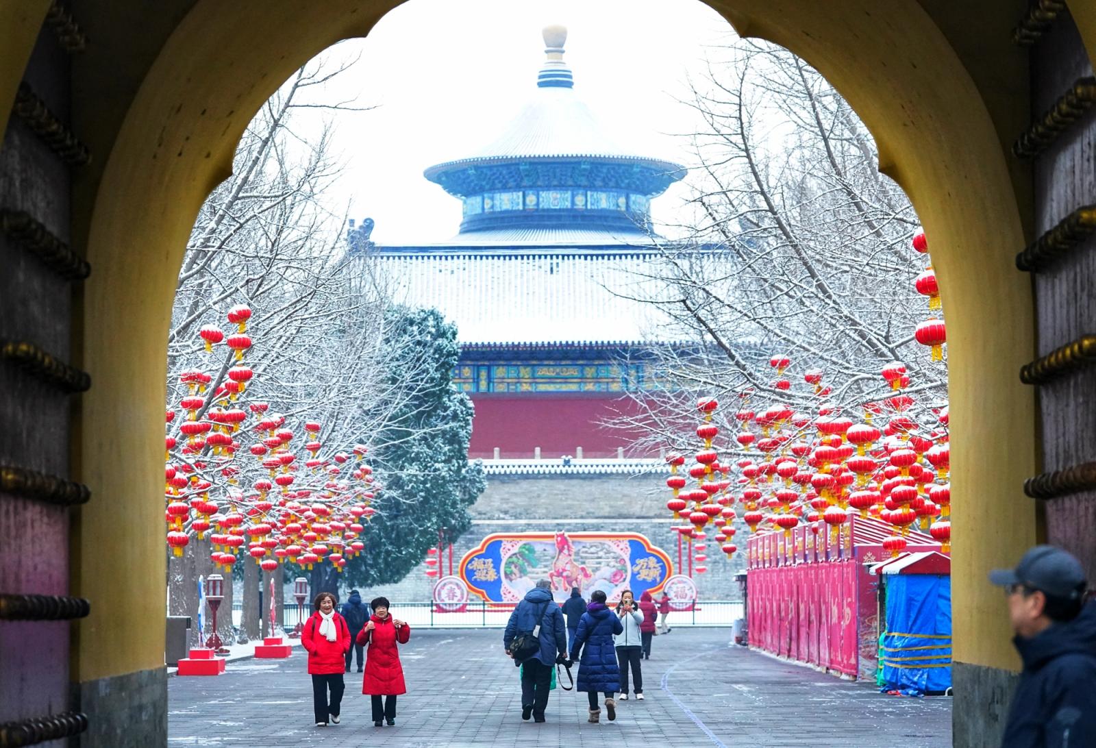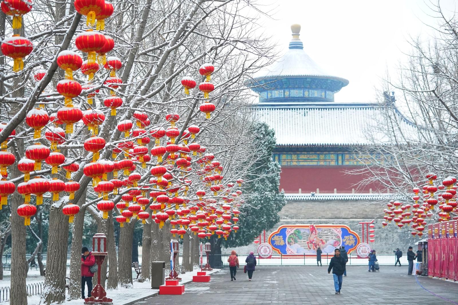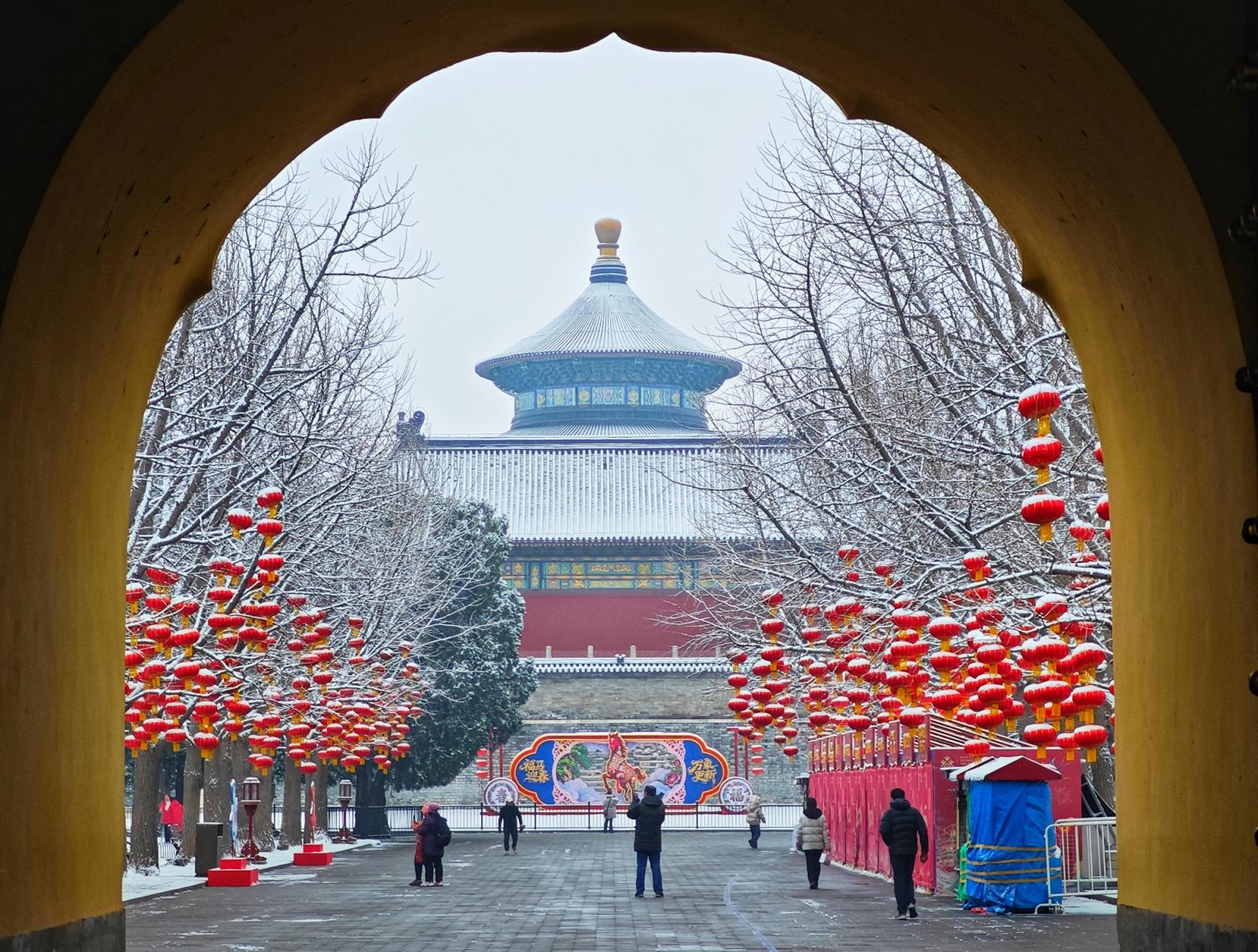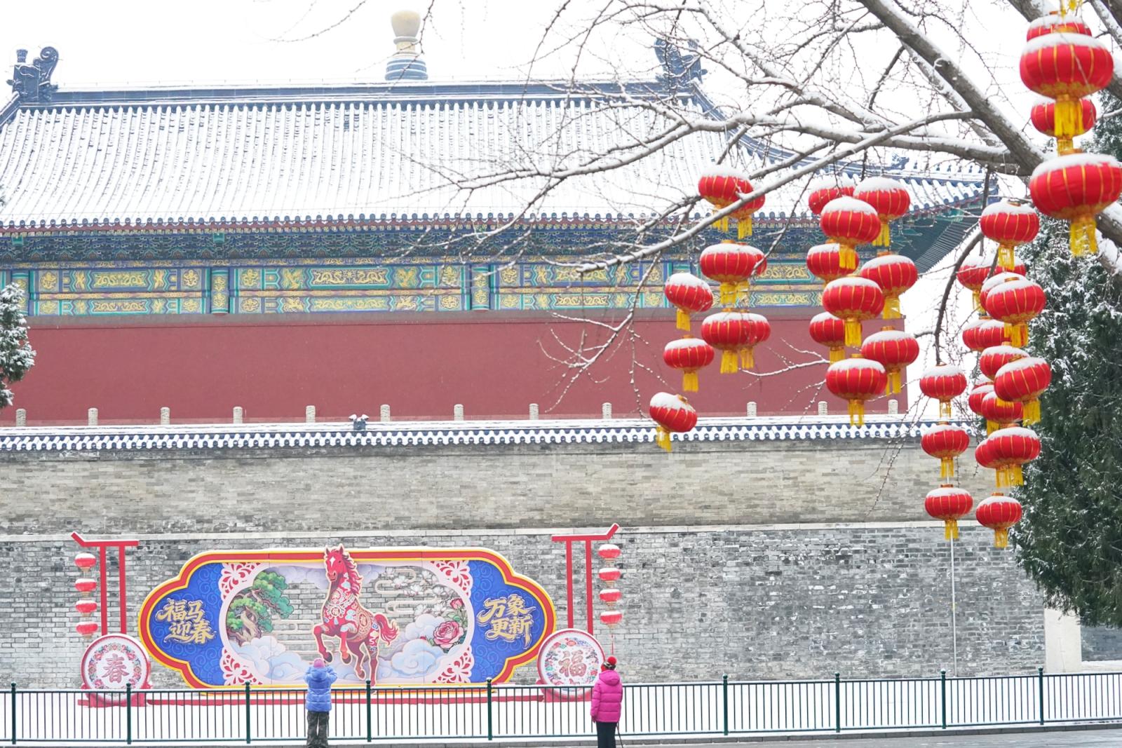 一场春雪飘落京城,雪后的天坛,祈年殿在白雪映衬下愈发庄严肃穆,挂满枝头的红灯笼覆着薄雪,园内,“福马迎春”主题装饰与雪景相映成趣,不少市民游客前来拍照打卡,定格这份独属于古都的春日浪漫。瑞雪添喜,天坛公园宛如一幅精美的画卷,展现着京城的历史底蕴和人文气息。