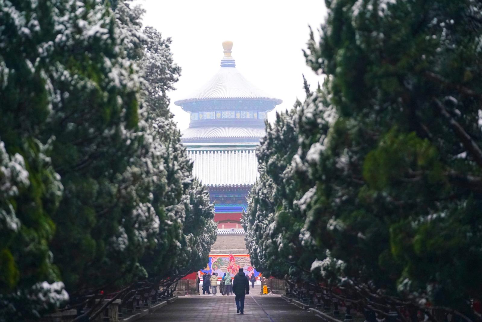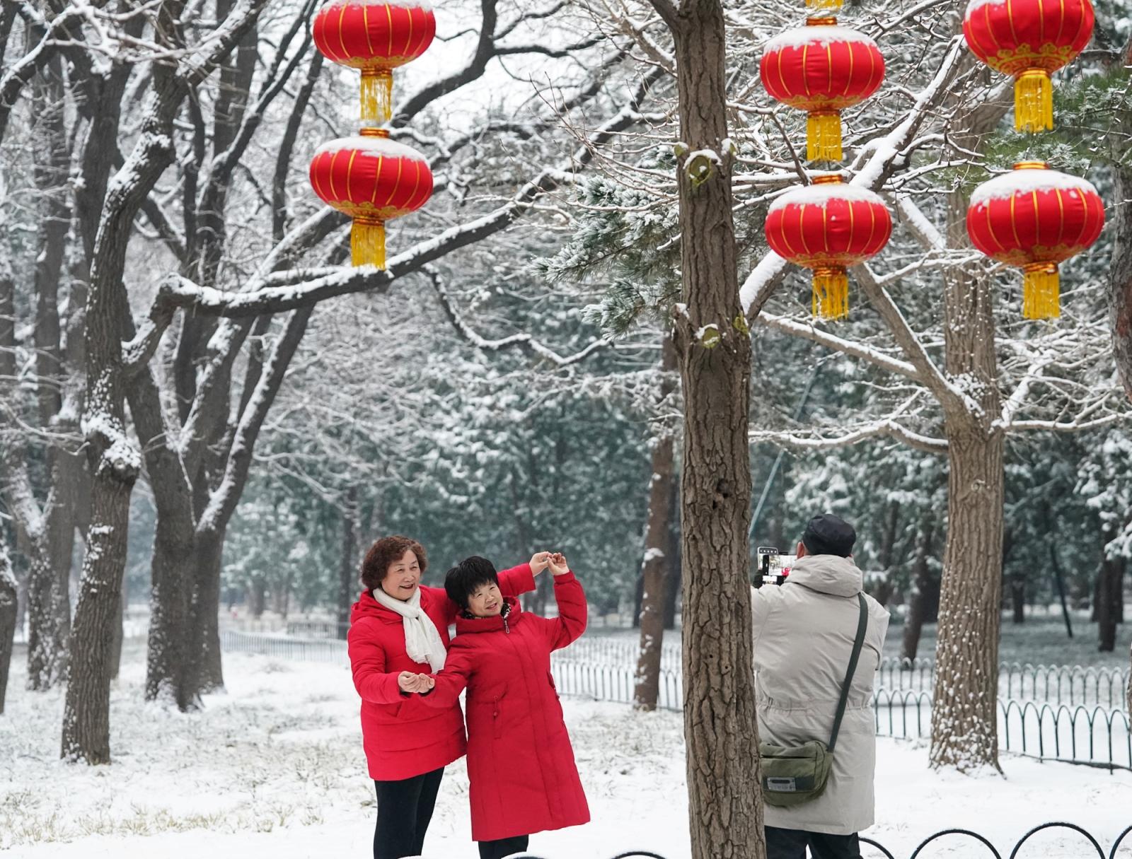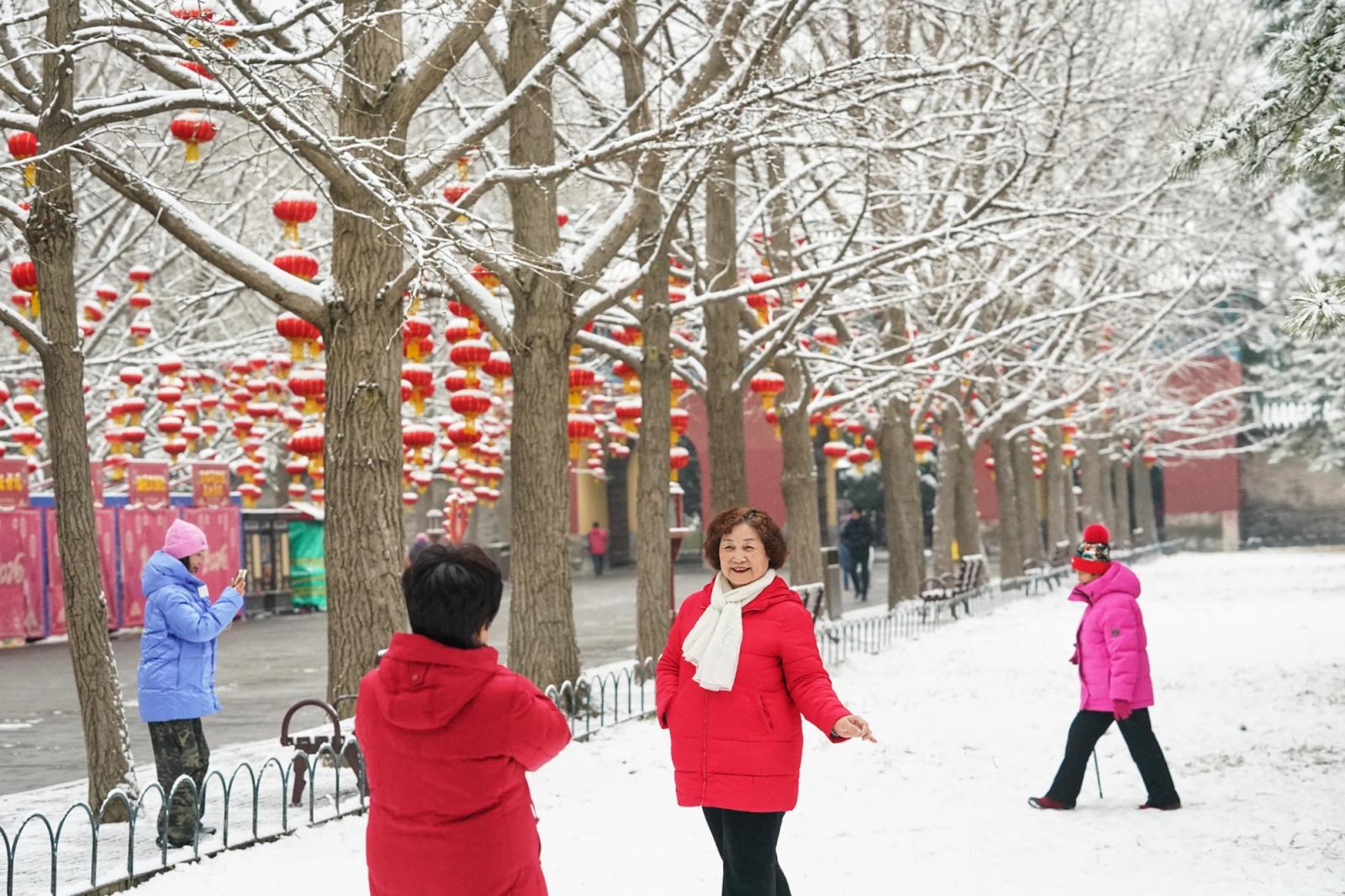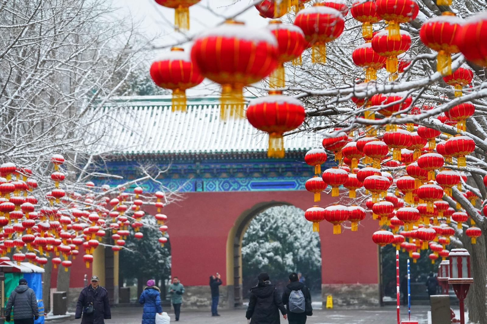 一场春雪飘落京城,雪后的天坛,祈年殿在白雪映衬下愈发庄严肃穆,挂满枝头的红灯笼覆着薄雪,园内,“福马迎春”主题装饰与雪景相映成趣,不少市民游客前来拍照打卡,定格这份独属于古都的春日浪漫。瑞雪添喜,天坛公园宛如一幅精美的画卷,展现着京城的历史底蕴和人文气息。