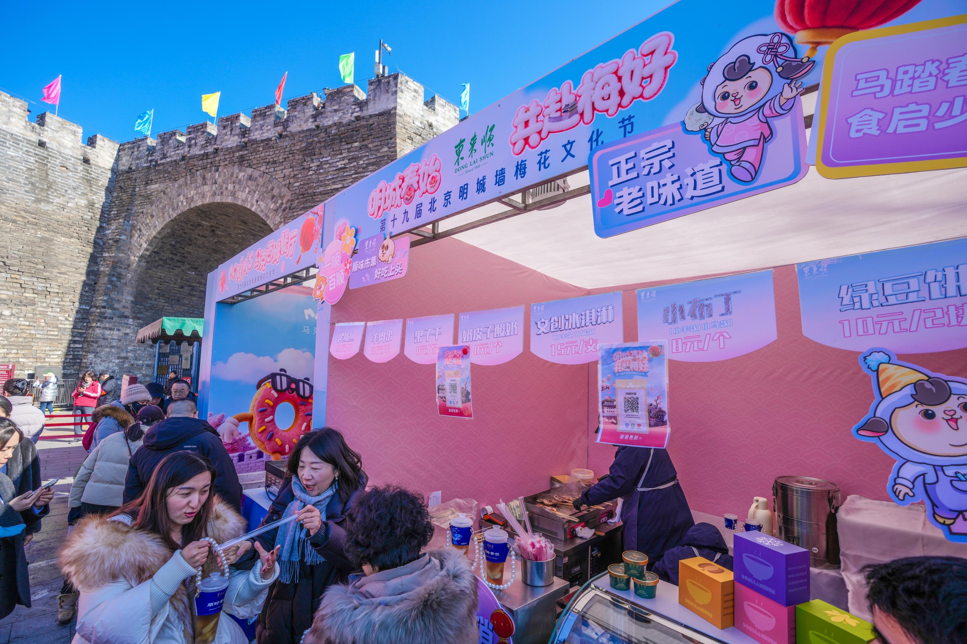 公园东侧的城墙脚下,集结了首旅集团旗下众多品牌的“城意梅好市集”摊位前熙熙攘攘,为游客奉上一场可逛、可吃、可玩、可分享的消费盛宴。东来顺展位的羊肉串、烤鱿鱼、顺时茶饮成为人气单品,北京野生动物园文创展位的小熊猫、卡皮巴拉玩偶都很抢手。王府井、北京国际饭店、长富宫饭店等市集摊位前,不少游客驻足选购,边走边逛边吃,再登上城墙俯瞰京城春光。