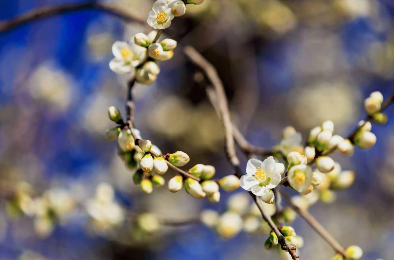 3月9日,北京朝阳区十里堡二道沟河畔,山桃花初绽放,一簇簇的花骨朵当中,数枝桃花抢先盛开,迎接明媚春天。
