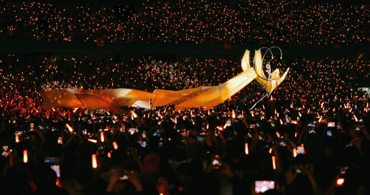 最终,和蔡依林一起现身的是整场最宏大的装置——高达七层楼高的 “愉悦之女” 装置缓缓升起,把不被定义、自我掌控的力量具象化为极致的视觉震撼,将全场的热情推至顶峰。多层升降机械与光影特效协同,让每一位观众都切实置身于这个可触摸、可沉浸的 “愉悦宇宙”。整场演唱会更设置了两次全场绕场巡游,在国内演唱会中尤为特别。无论是近距离与观众互动,还是让每一个角落都能清晰感受舞台氛围,都让这份愉悦真正 “抵达” 每一位观众。