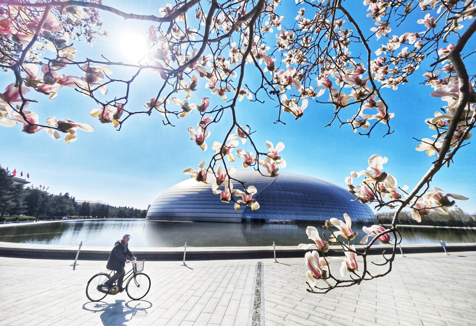 洁白的花朵缀满枝头,与剧院现代感的穹顶、水面交相辉映,勾勒出长安街醉人的春景。
