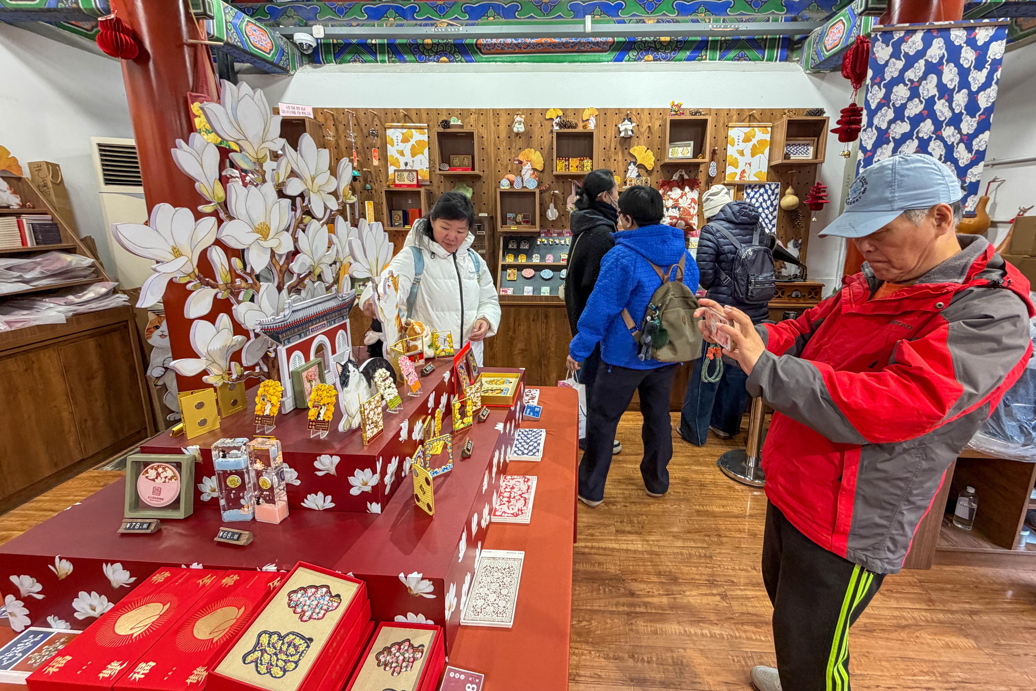 “这套‘金玉满堂’系列文创,灵感来源于万寿寺内栽植的7株玉兰和3株海棠,既取花名谐音,也寓意十全十美。”艺博业务部主任徐衍伟站在小铺旁,向观众讲述最受欢迎的一款文创幕后,“这对冰箱贴以玉兰花为造型,让馆宠猫咪糖糖和秀秀安稳地窝在花蕊里,更具治愈感。仔细看,花瓣上镶嵌着蝙蝠纹,把‘洪福齐天’的美好寓意藏在细节里。”