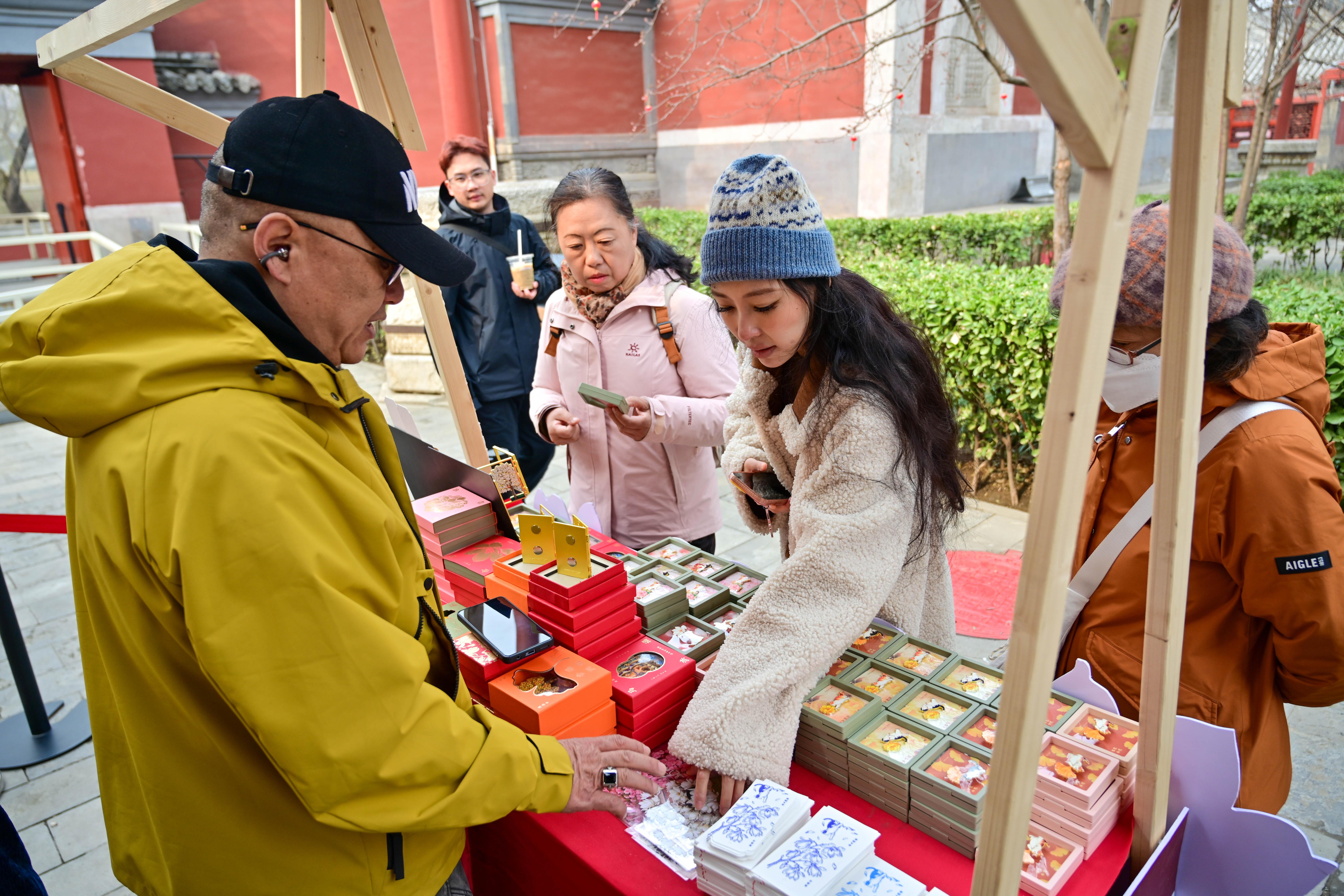 此次玉兰季将持续10天,艺博推出了10余款主题文创和系列体验活动。徐衍伟举例,福袋挂件、纪念票、徽章等多种品类的文创产品已经上架。观众还可以亲手制作一张玉兰主题明信片,欣赏“诗乐相逢”文化表演等。“希望大家将博物馆的春色随身携带,通过这些应季文创和活动,了解文物背后的故事,感受万寿寺的福寿文化。”