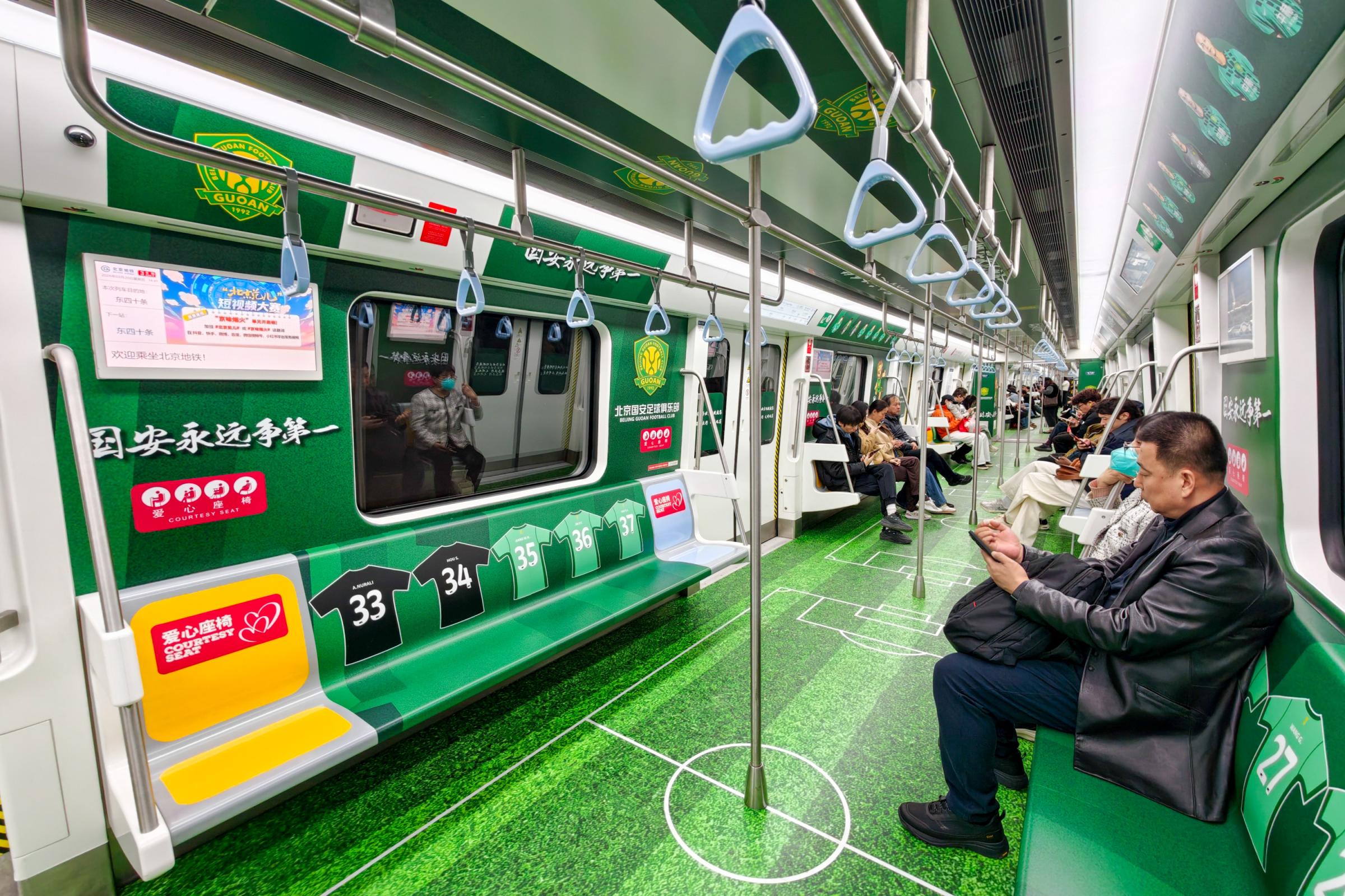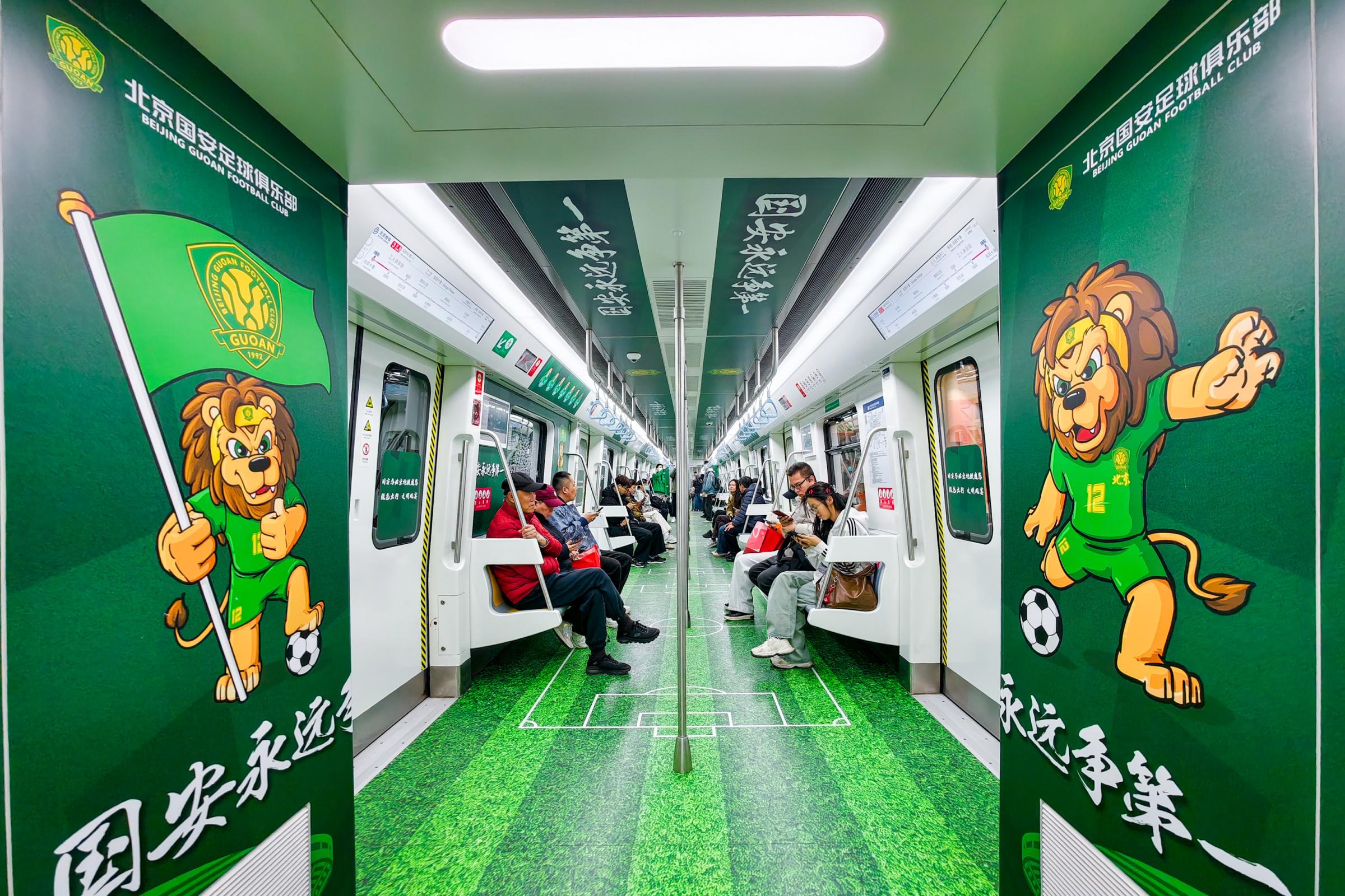 除了主题车站之外,北京地铁还在3号线打造了一列国安球员主题列车,成为观赛球迷们的“移动绿茵主场”。