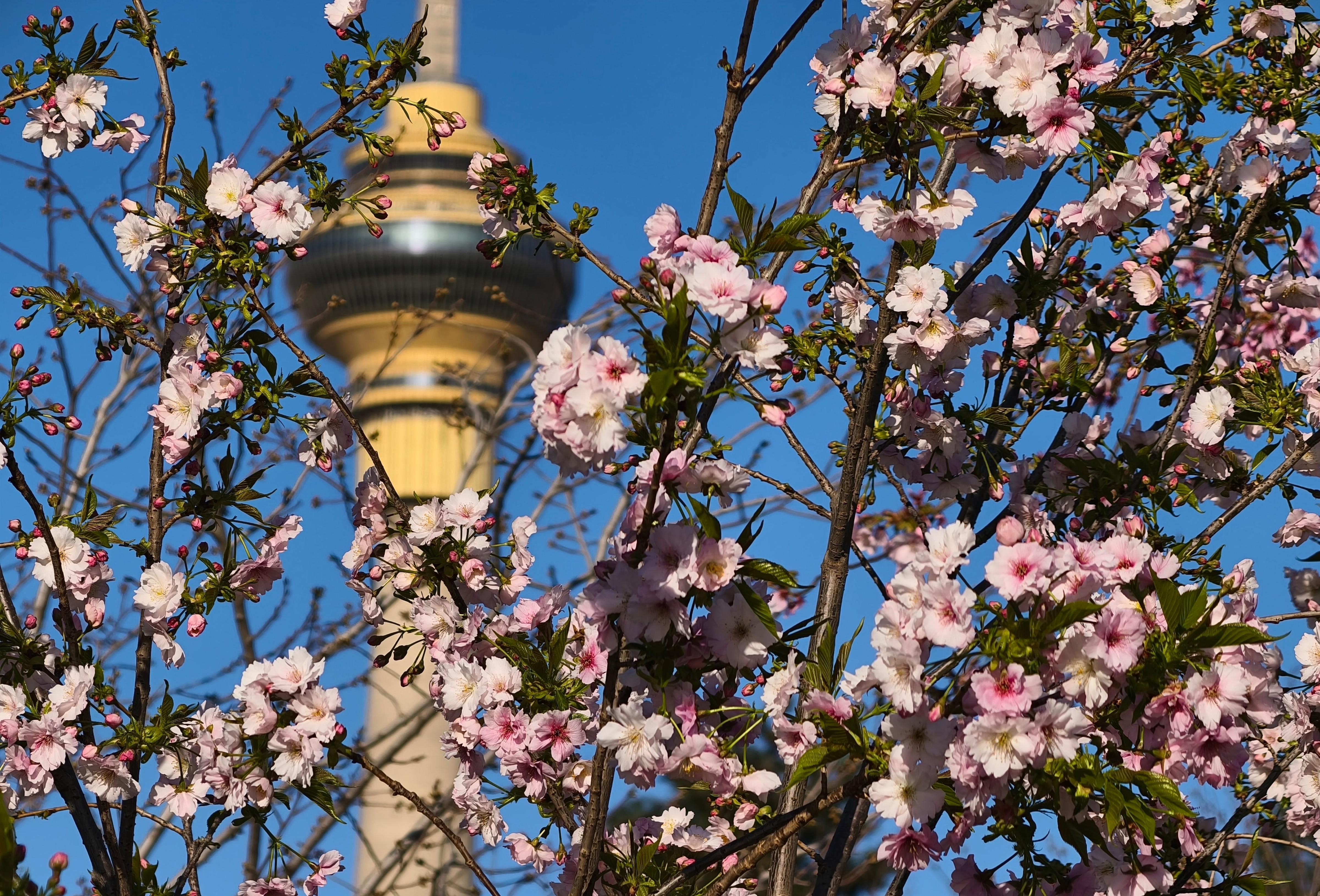 100余株樱花已经灿烂绽放,只见粉白的花瓣层层叠叠,像揉碎了的云霞,轻轻落在枝头。远处的中央电视台映衬在花丛当中,成为最经典的打卡机位。