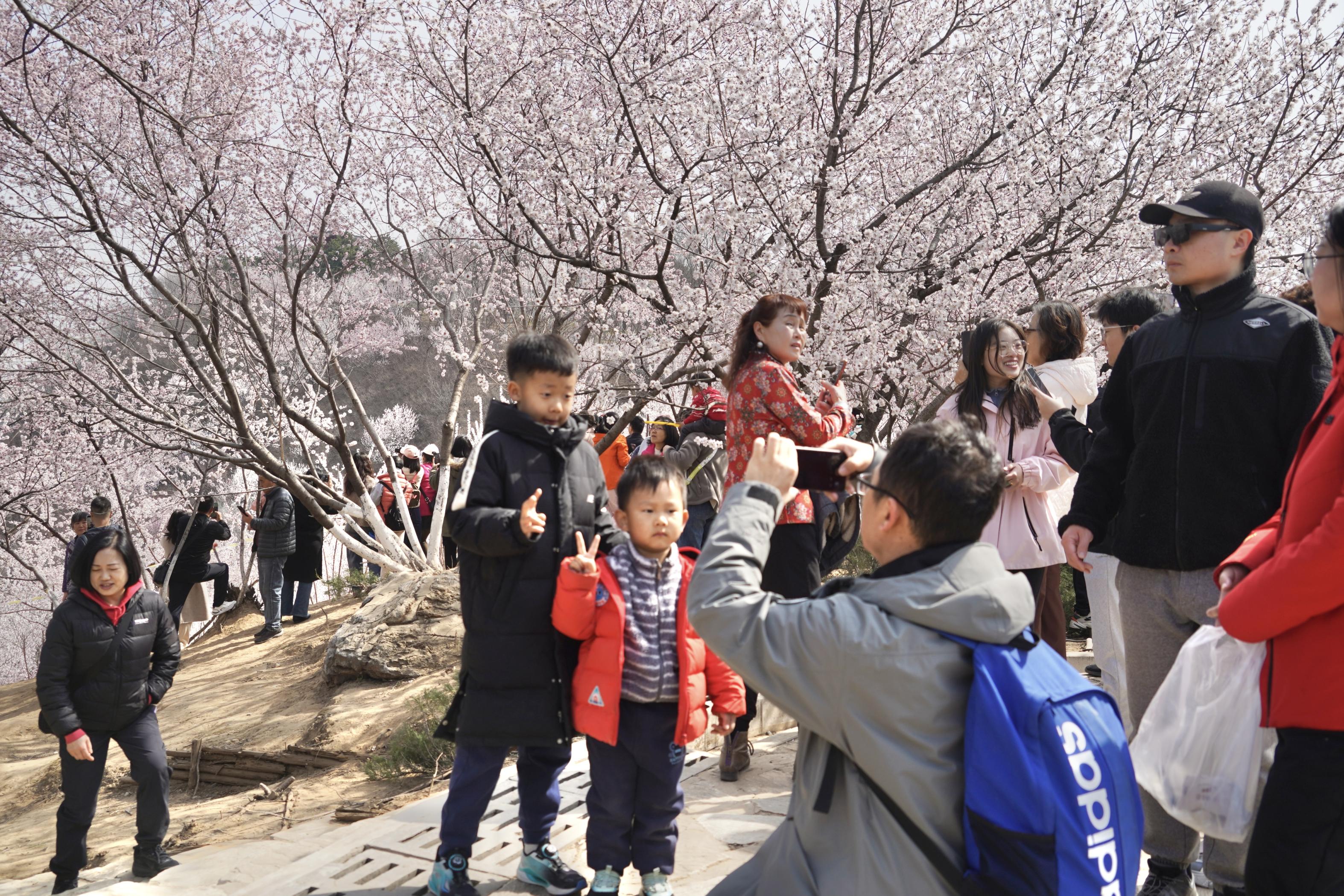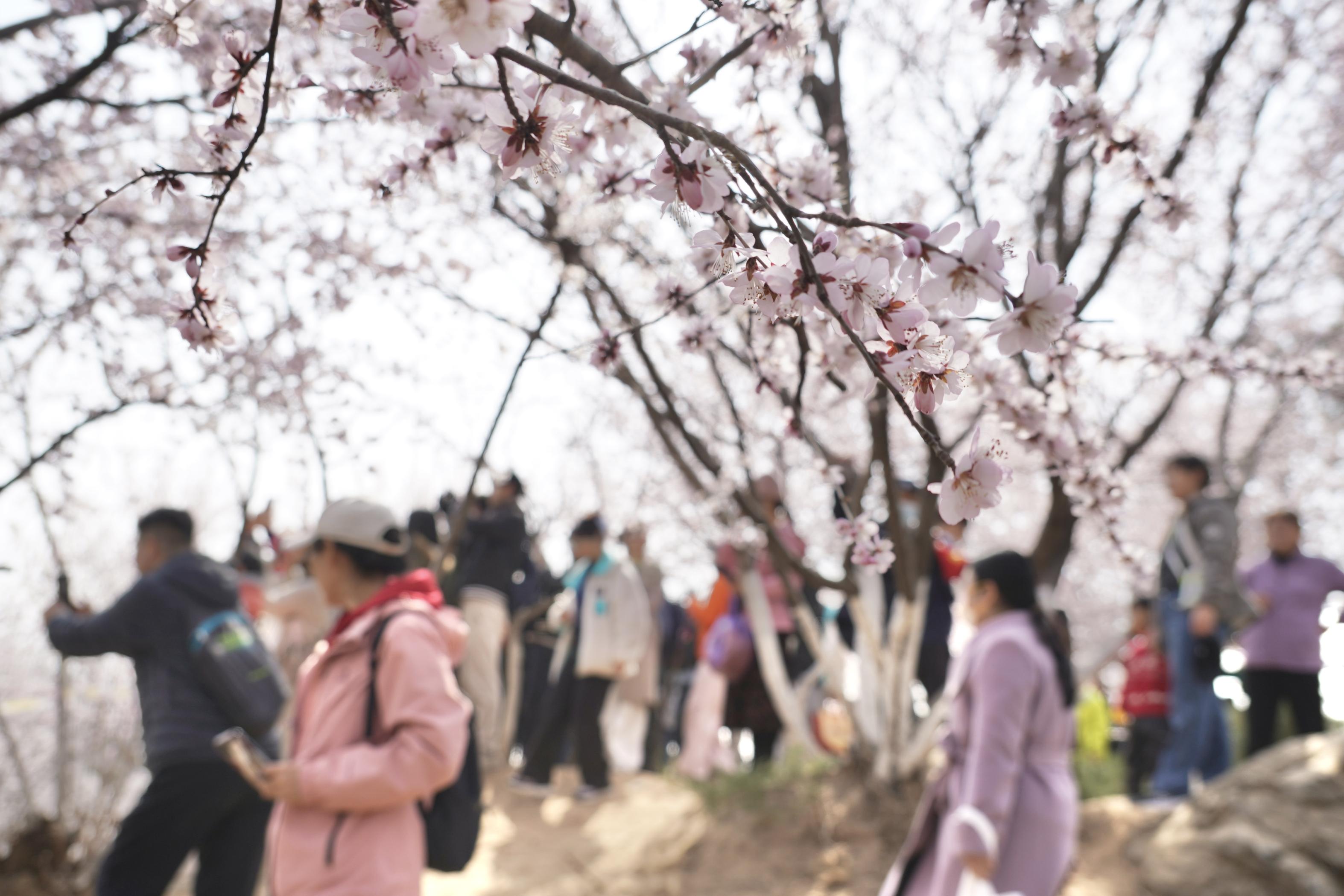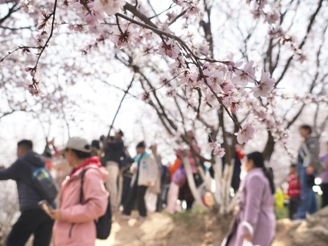 园区内的桃花谷开花率已达八成,山桃花沿山谷连绵绽放,粉白花海如云似霞,与永定塔、文源亭相映成趣,勾勒出京城春日醉美画卷。