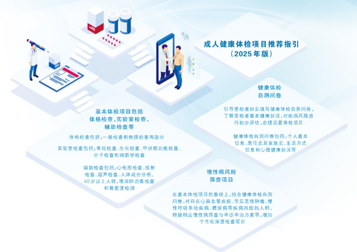 今年的《政府工作报告》提出,“实施健康优先发展战略,健全健康促进政策制度体系”。体检是维护健康的重要防线,是促进全民健康的重要手段。为了规范成人健康体检,2025年10月,国家卫生健康委办公厅印发《成人健康体检项目推荐指引(2025年版)》(以下简称《指引》),同时发布的还有2025年版健康体检自测问卷、基本体检项目、慢性病风险筛查项目、成人健康体检工作流程图、常见慢性病风险评估指标等。