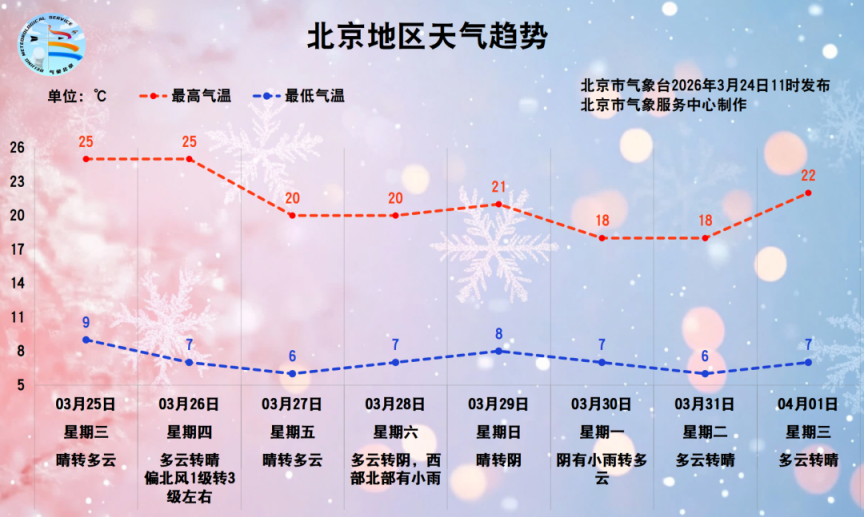 2026年3月25日至4月1日白天最高气温18~25℃,夜间最低气温6~9℃。