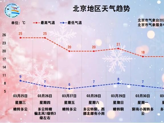 3月25日白天(周三):晴间多云;北转南风2-3级;平原地区最高气温25℃,山区最高气温23~25℃;最小相对湿度25%。
