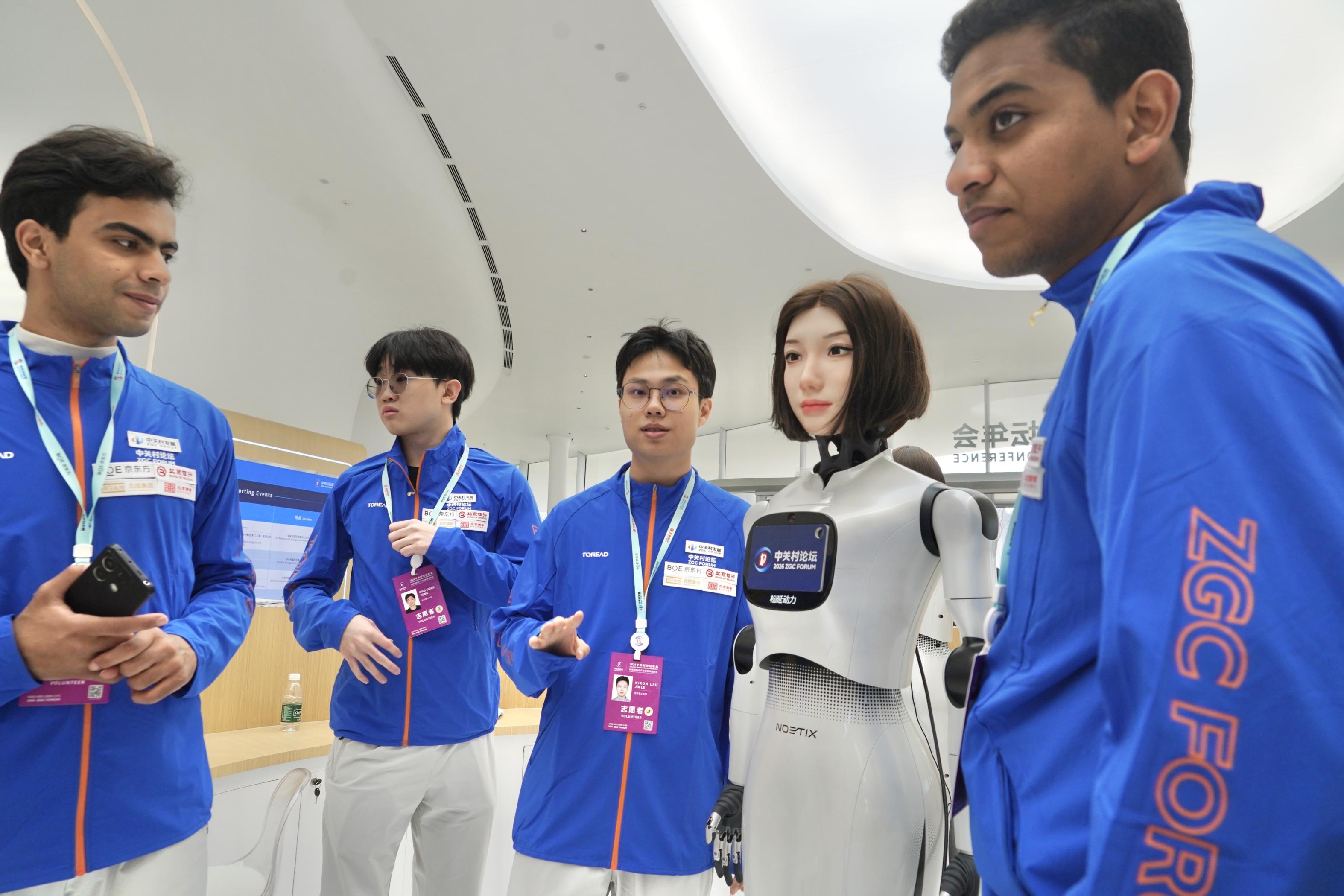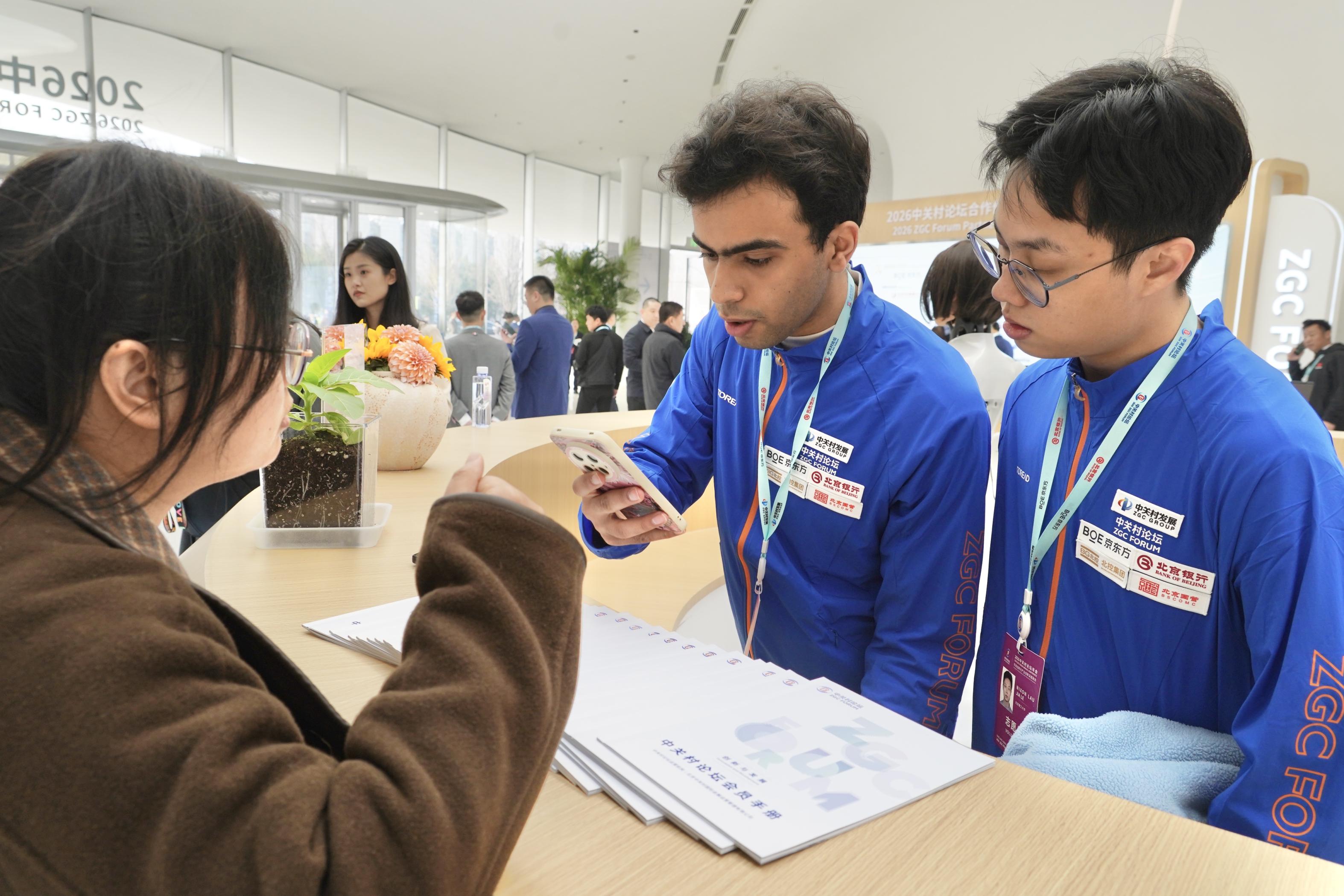 3月25日,2026中关村论坛年会现场,北京理工大学志愿者、来自埃及的留学生小龙、来自马来西亚的留学生刘家乐,和同学们一起在服务台为与会嘉宾提供志愿服务。