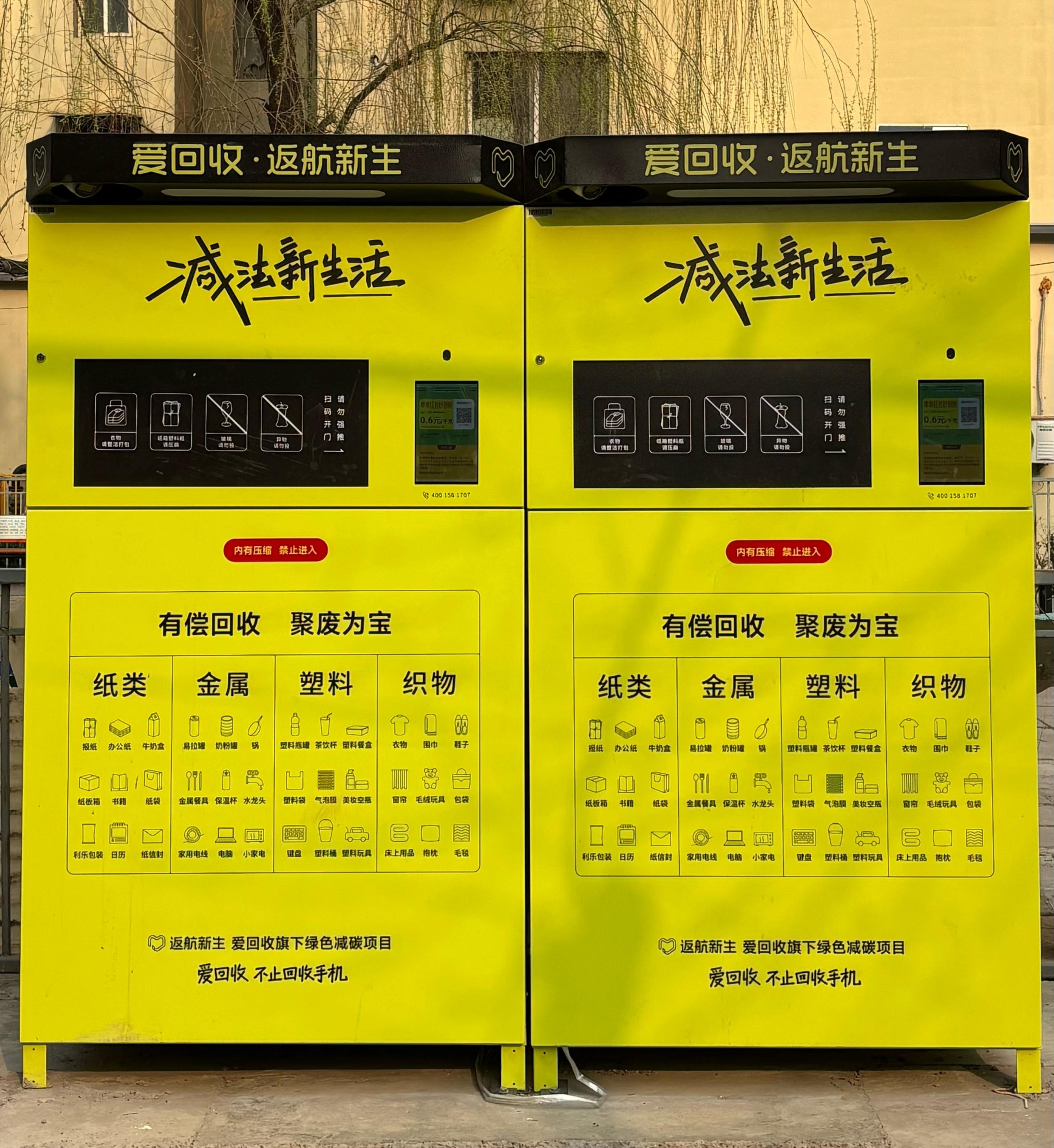 相隔数百米外,蒲安北里小区9号楼附近,并排摆放着两台鲜黄色回收机,它们是由万物新生集团投放的“爱回收”,使用方式是微信扫码。