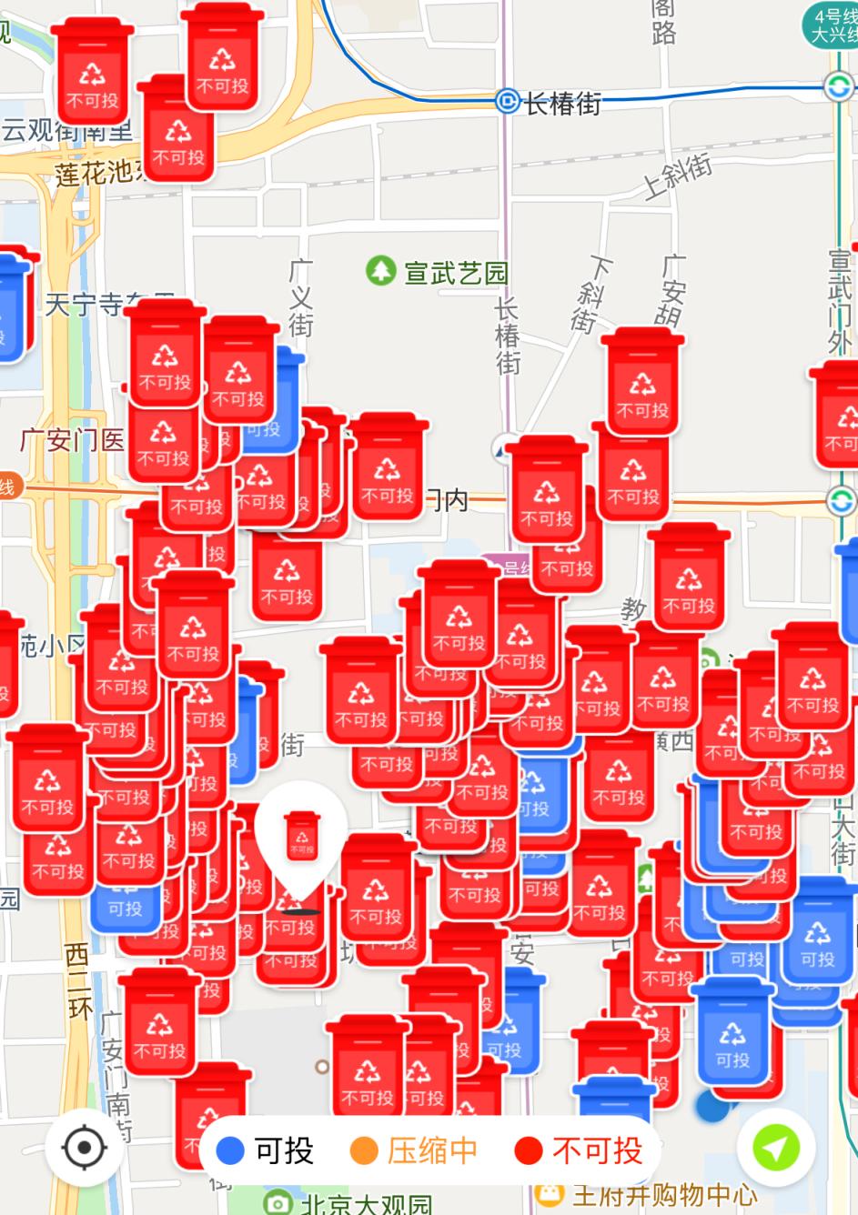 记者在小程序上进一步查看“京环分类”的全市点位情况,发现顺义、通州等以“可投递”的蓝色图标居多,而在居住密度较高的核心区,尤其是西城区,一眼望去则明显以“不可投递”的红色图标占据上风。3月27日中午12时、傍晚5时,选取同一区域查看,皆是如此。