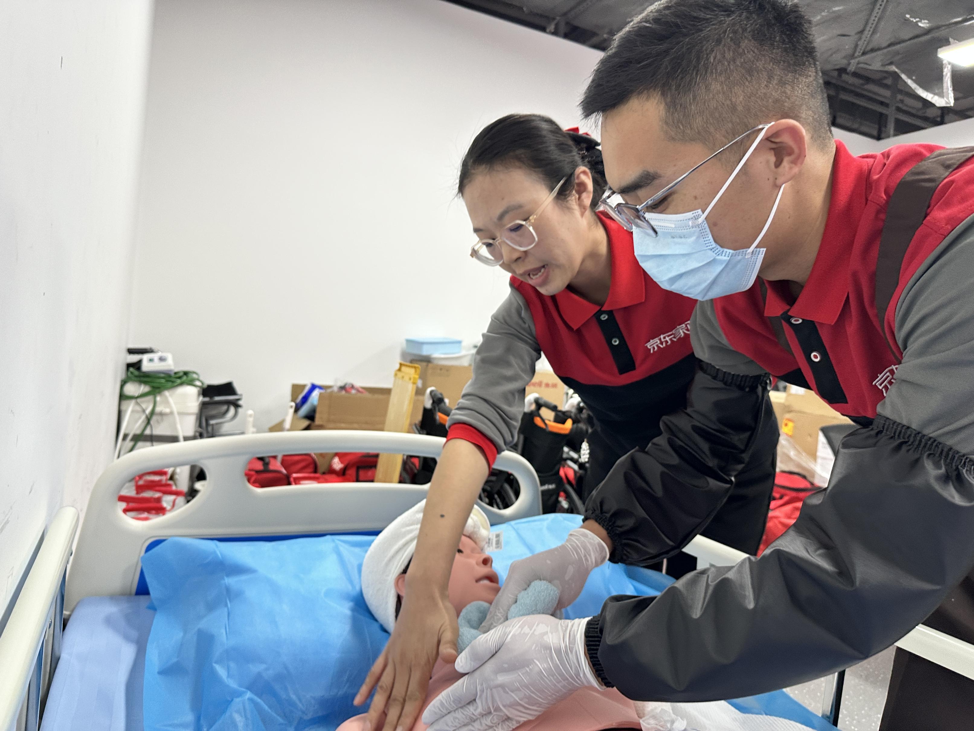 位于南三环的京东家政北京培训中心,每周都会举行养老护理培训班。和普通的家政培训相比,“家政+养老”的培训时间更长,考核也更加严格。“普通家政培训只有3天,‘家政+养老’培训是5天。”才识介绍,在5天的培训中,其中3天都是养老方面的内容,包括老年人日常生活照料、助浴、生命体征监测,以及应急情况处理等。剩下的两天,除了一天培训保洁等家政技能外,还有一天是学习陪诊方面的内容。