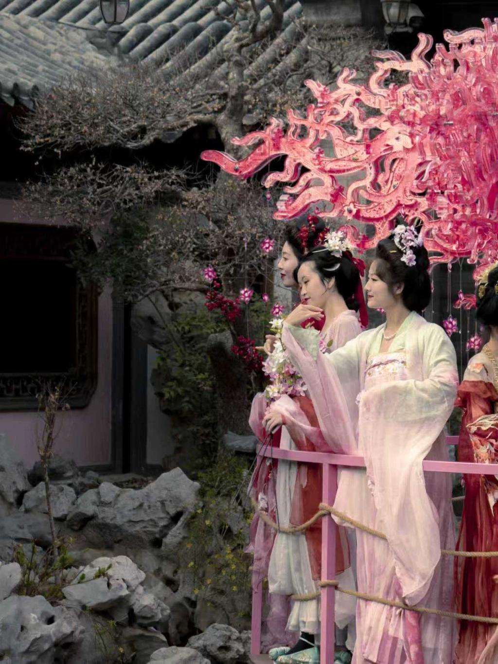 而在故宫附近的南池子美术馆,艺术与自然之美亦是紧密融合。水池假山错落有致,曲廊蜿蜒通幽。庭院中央,一株由亚克力装置构成的巨型桃花树夺人眼球,600片剪纸与2000公斤亚克力构件叠加出兼具传统意境与科技感的视觉奇观。62岁的王阿姨在此流连忘返,她感慨:“以前逛公园拍花年年都一样,现在女儿带我们来美术馆,感觉像打开了一扇新门。”