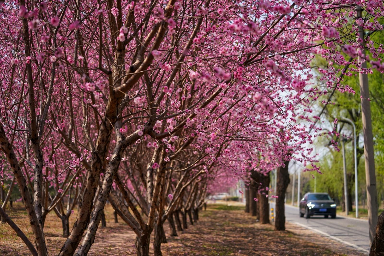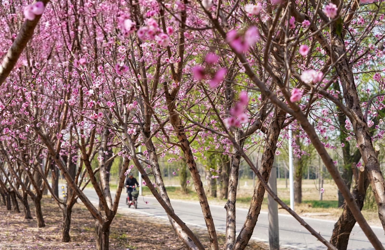 春风送暖,通州区台湖镇西下营村乡村公路旁的美人梅迎来盛花期。