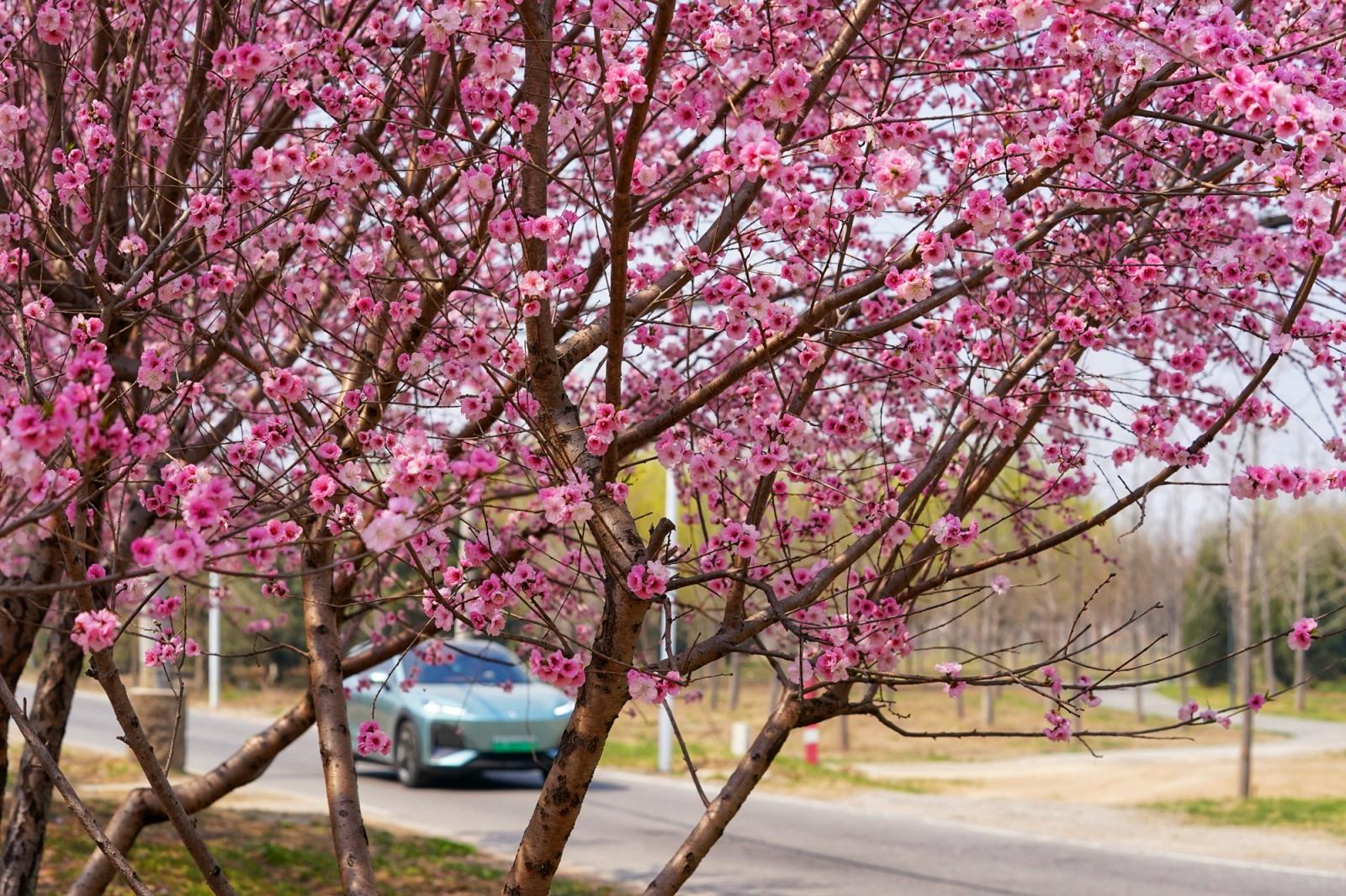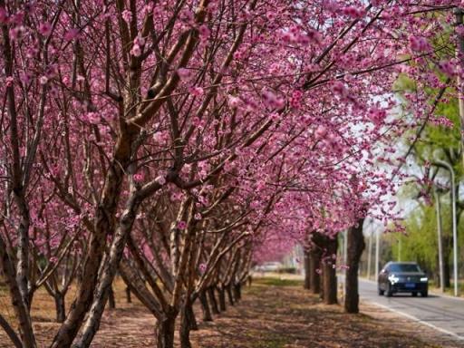 成排的花树沿道路绵延,粉红花枝如云似霞,在春日暖阳下铺就出一条浪漫的“花廊”。盛放的美人梅缀满枝头,粉艳的花朵与道路、绿树相映成趣,晨跑的市民、行驶的车辆穿行其间,让这条乡村路充满诗意。