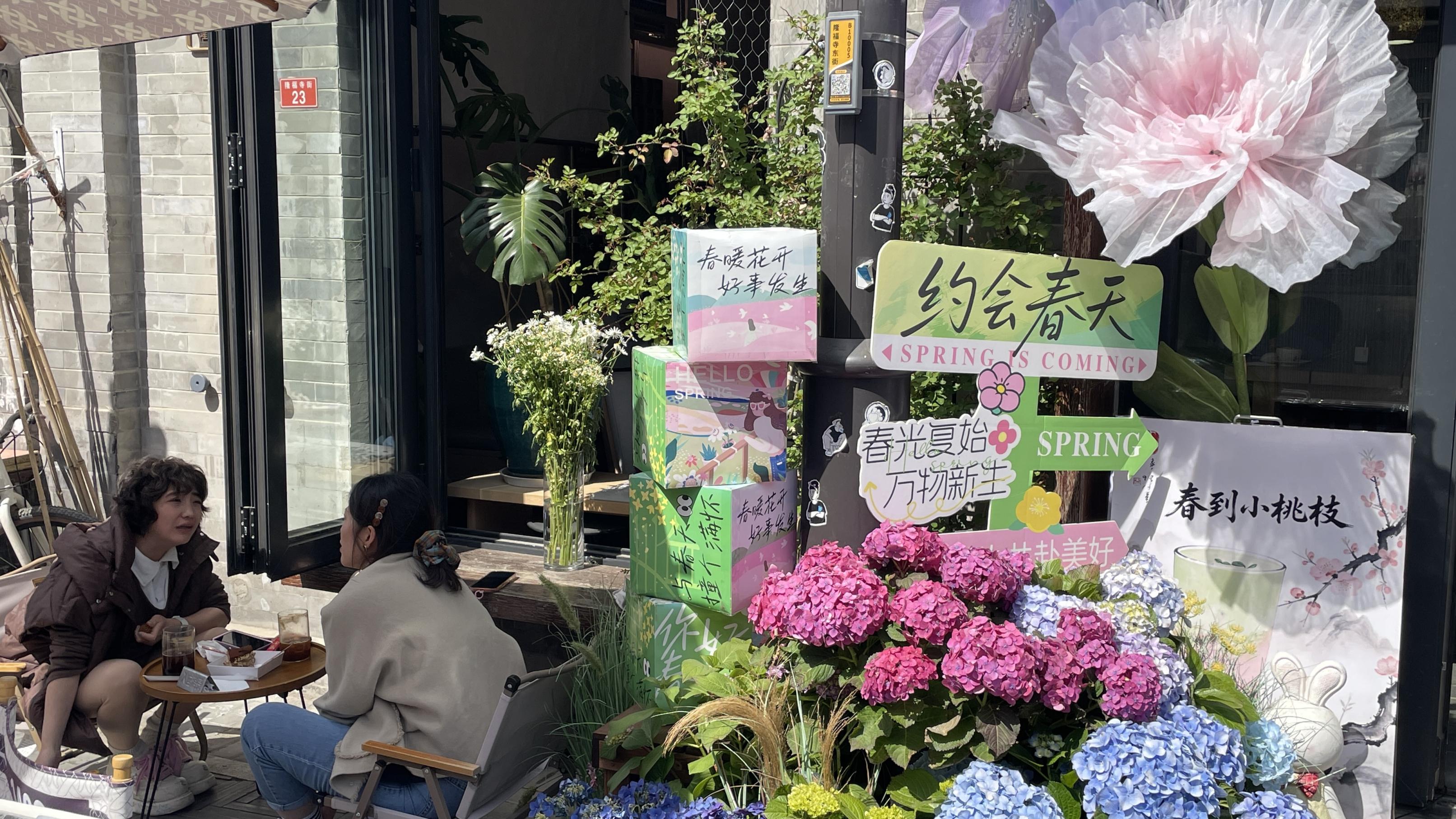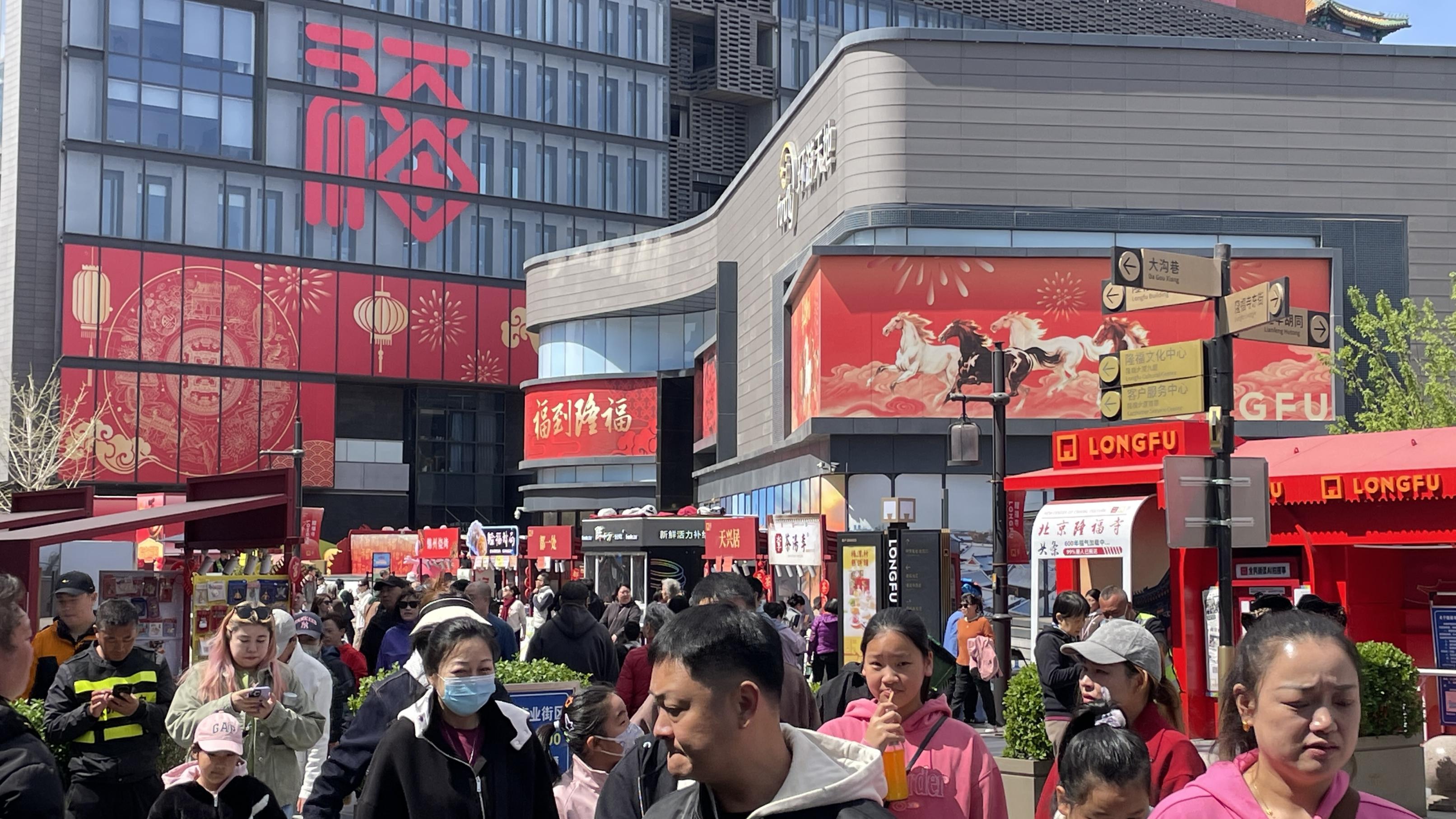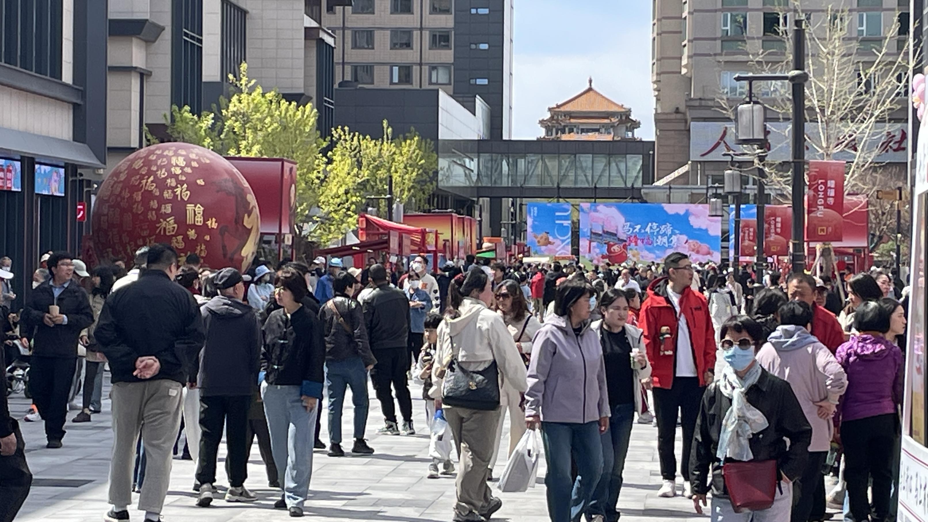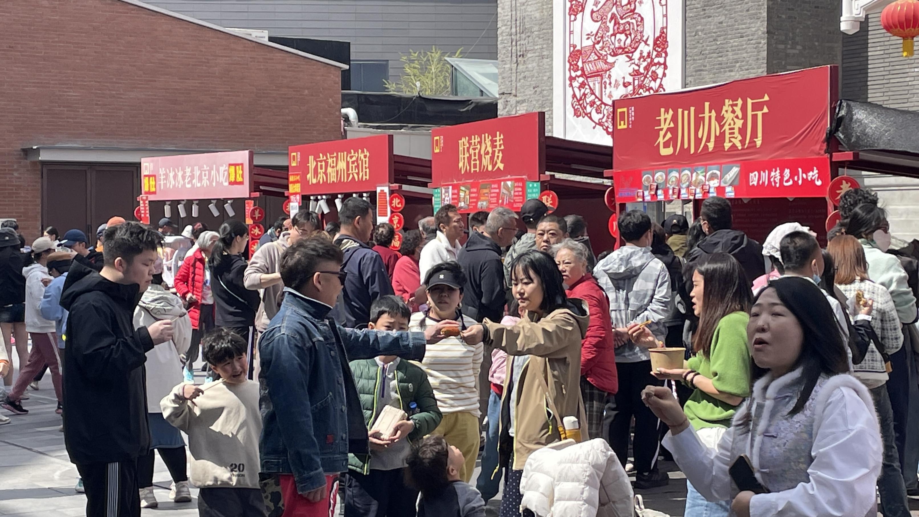 清明假期最后一天,隆福寺商业街游客熙熙攘攘,暖阳下品尝着老北京的味道、约会春天。